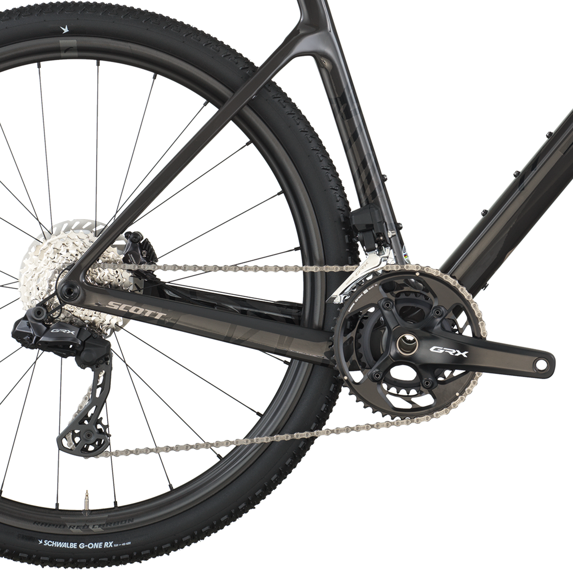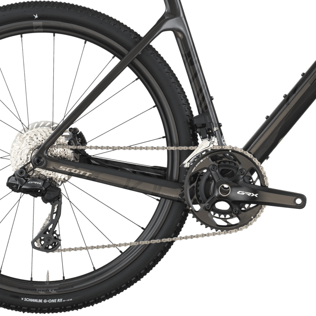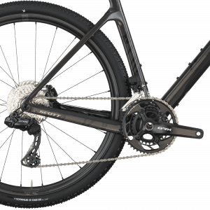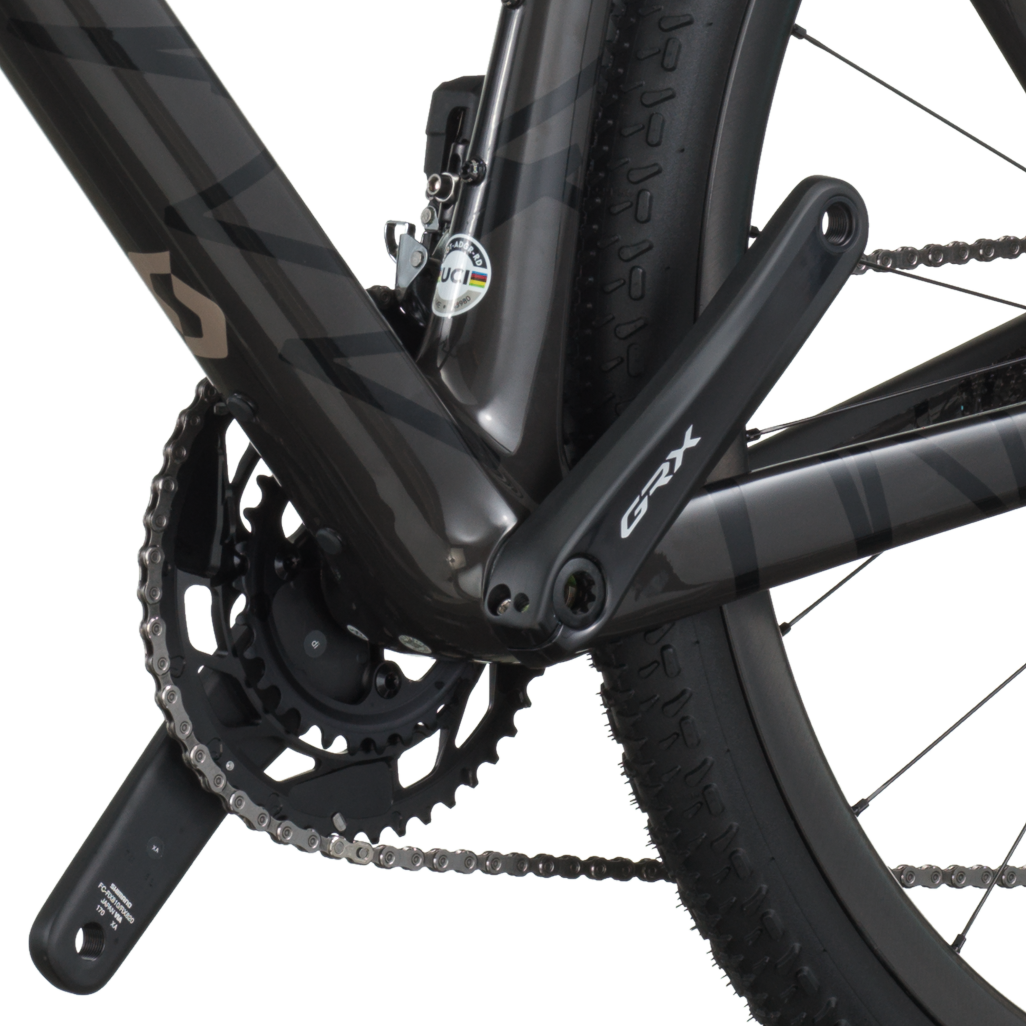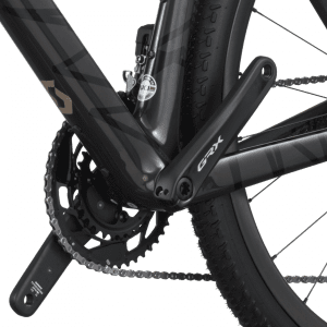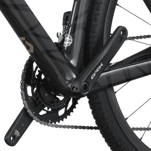 La transmission est un Shimano GRX Di2 24 vitesses (manettes ST-RX825 + dérailleurs RD-RX825/FD-RX825F), pour des changements électroniques précis et fluides quelles que soient les conditions de terrain.