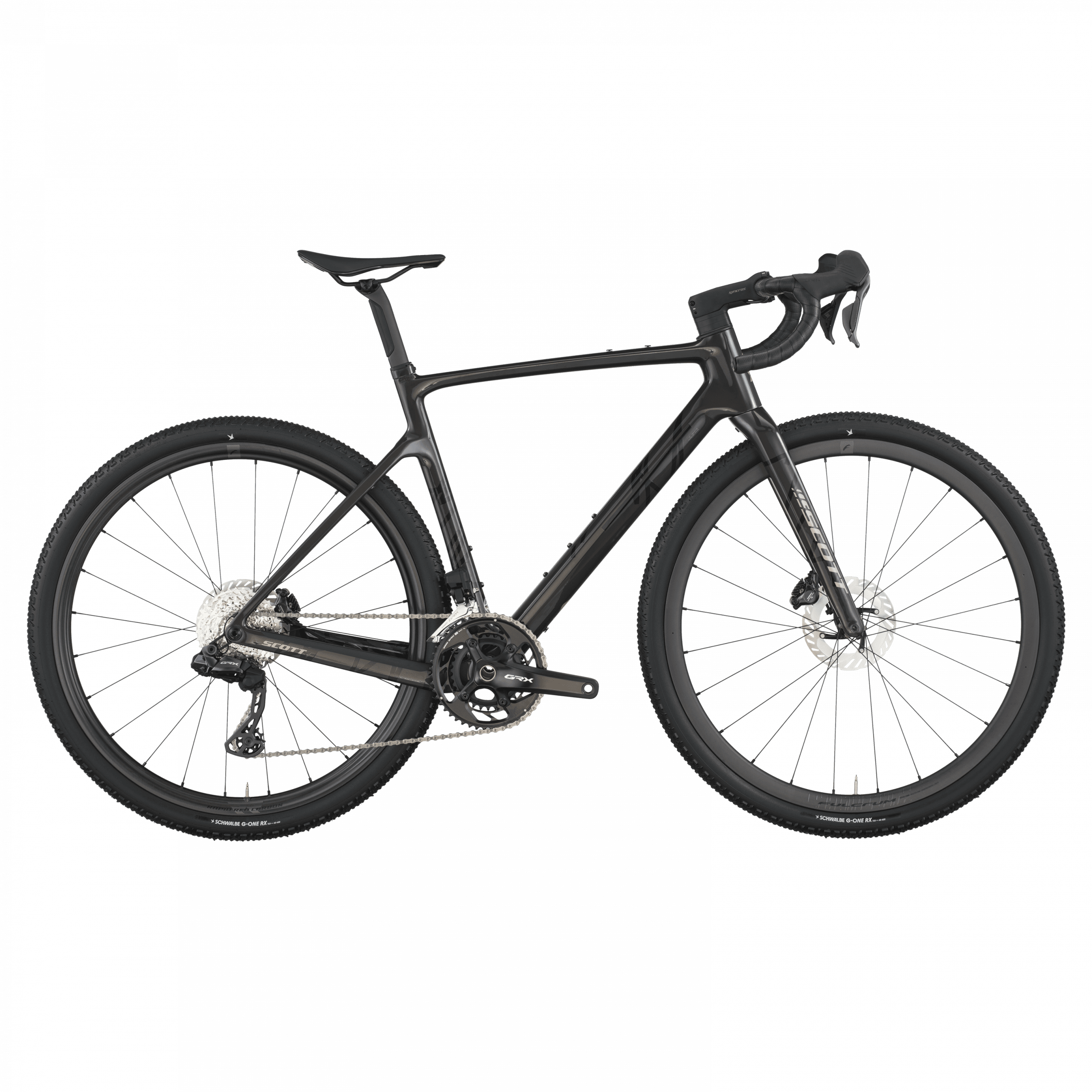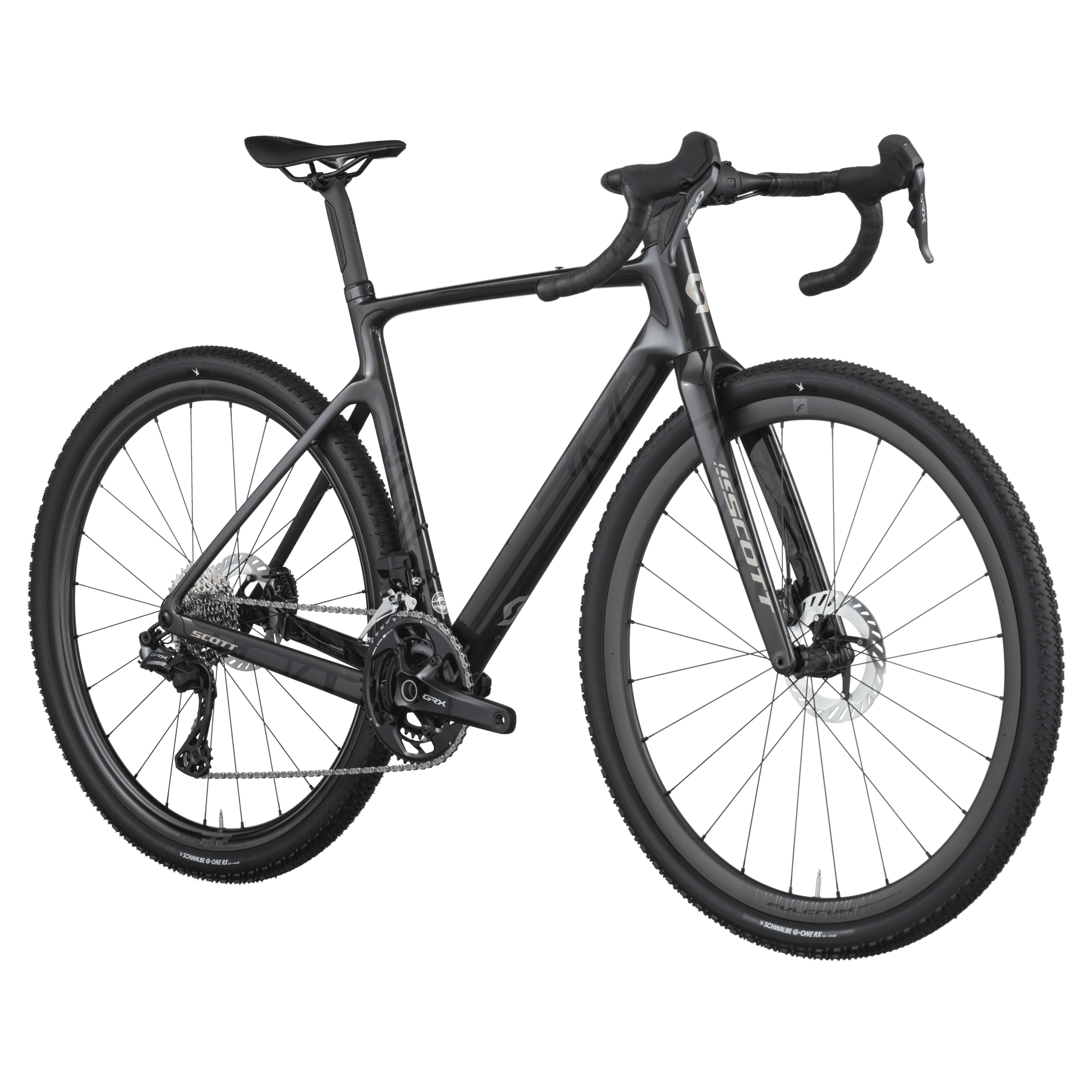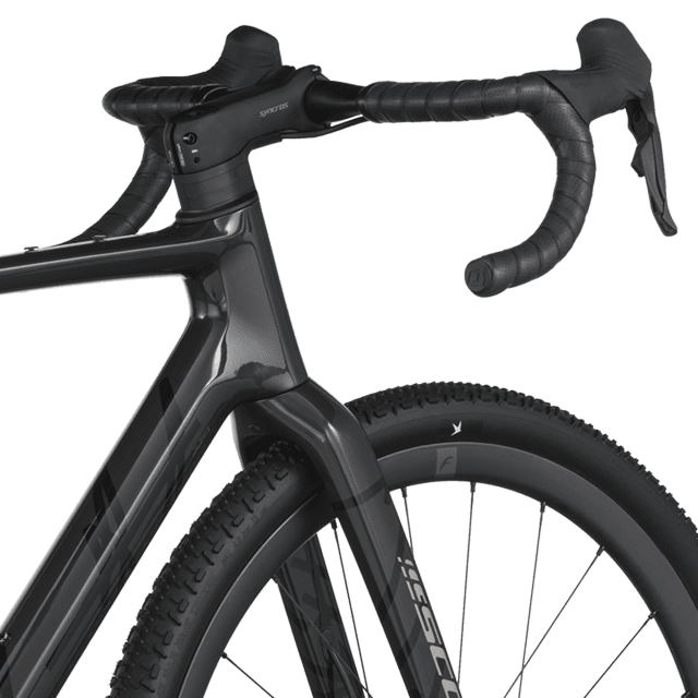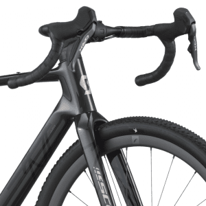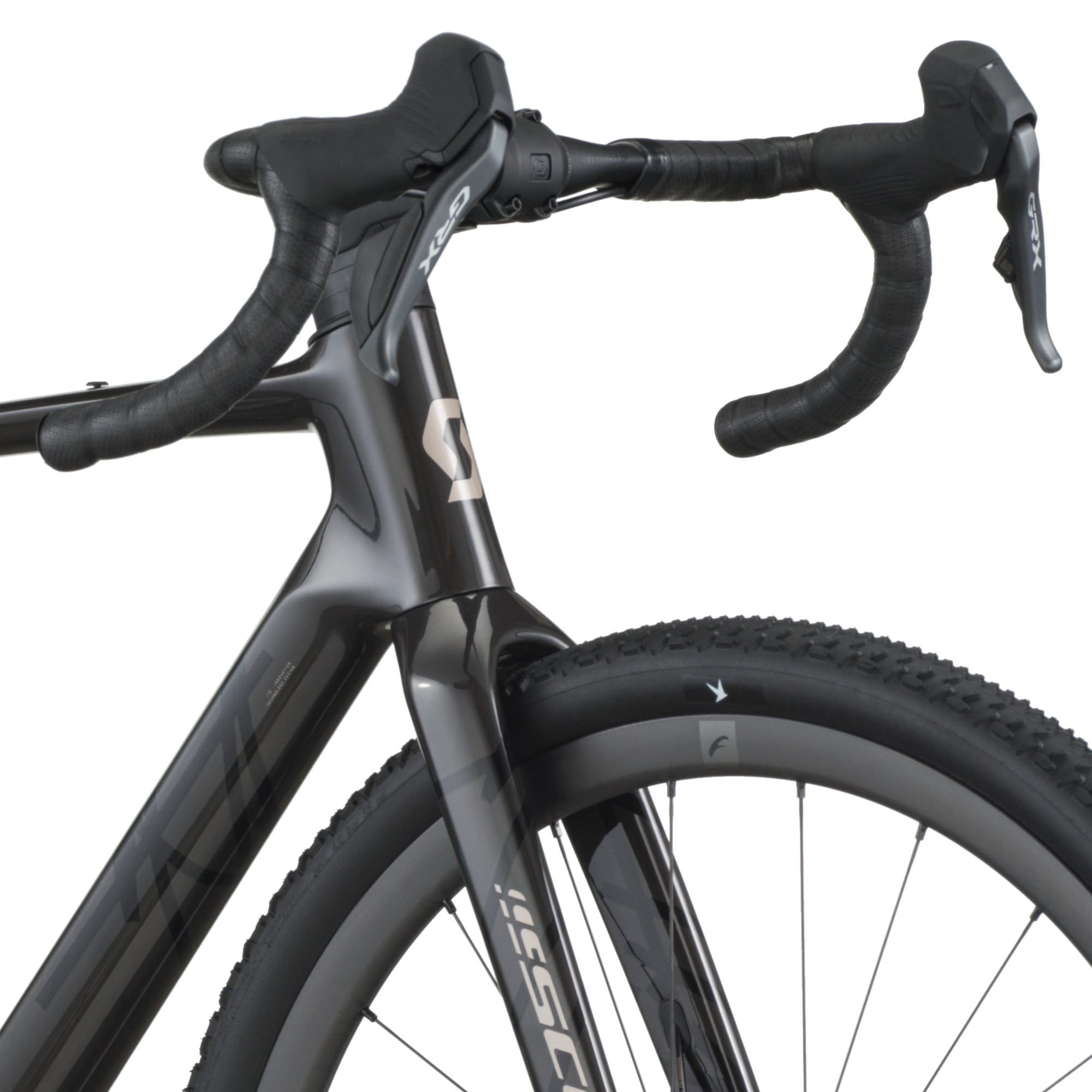 La transmission est un Shimano GRX Di2 24 vitesses (manettes ST-RX825 + dérailleurs RD-RX825/FD-RX825F), pour des changements électroniques précis et fluides quelles que soient les conditions de terrain.