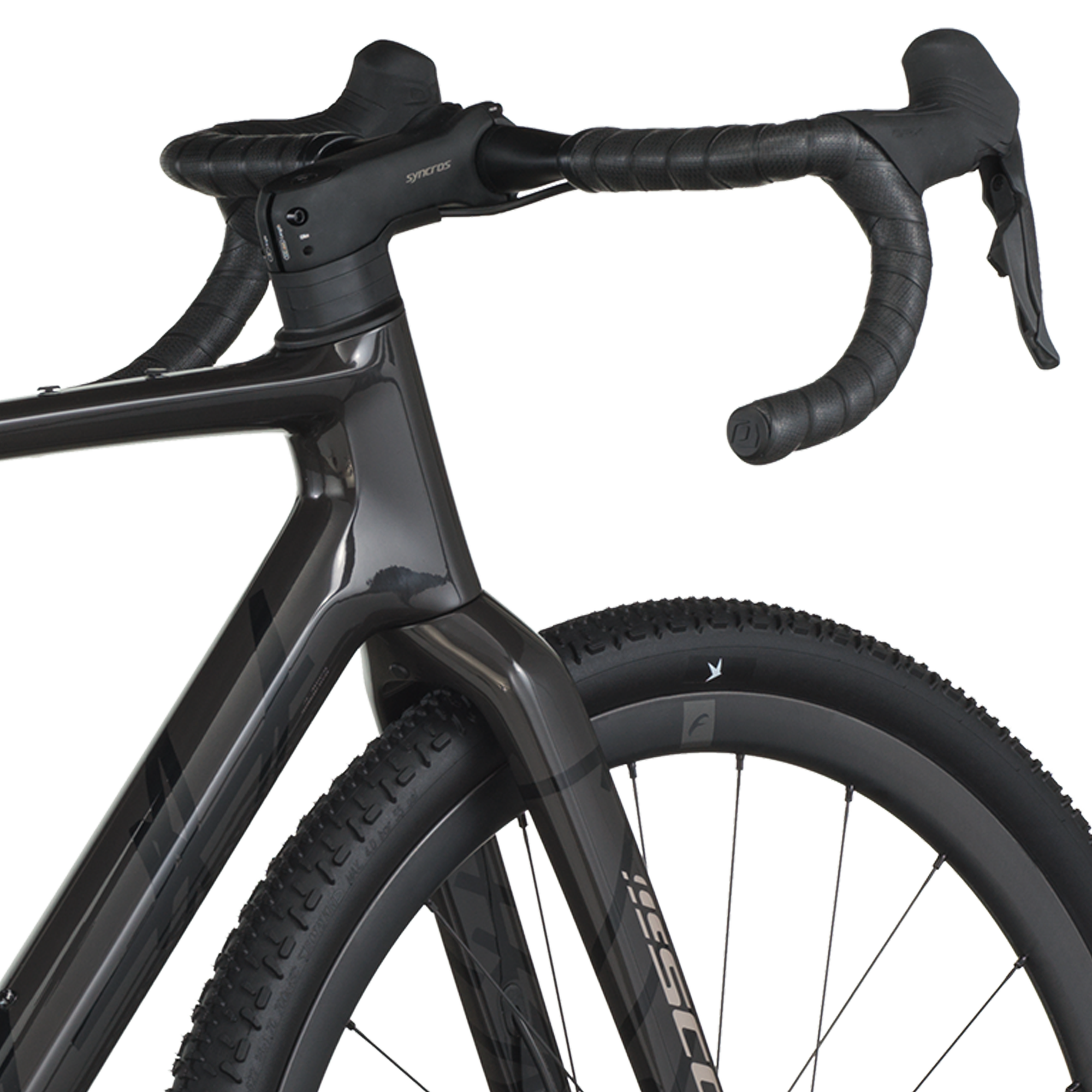 L’équipement comprend un poste de pilotage Syncros Creston 1.0 X carbone, tige de selle Syncros SP-R101-CF, roues Fulcrum Rapid RED carbone et pneus Schwalbe G-One RX 700×45C, pour un ensemble performant, léger et prêt à l’aventure.
