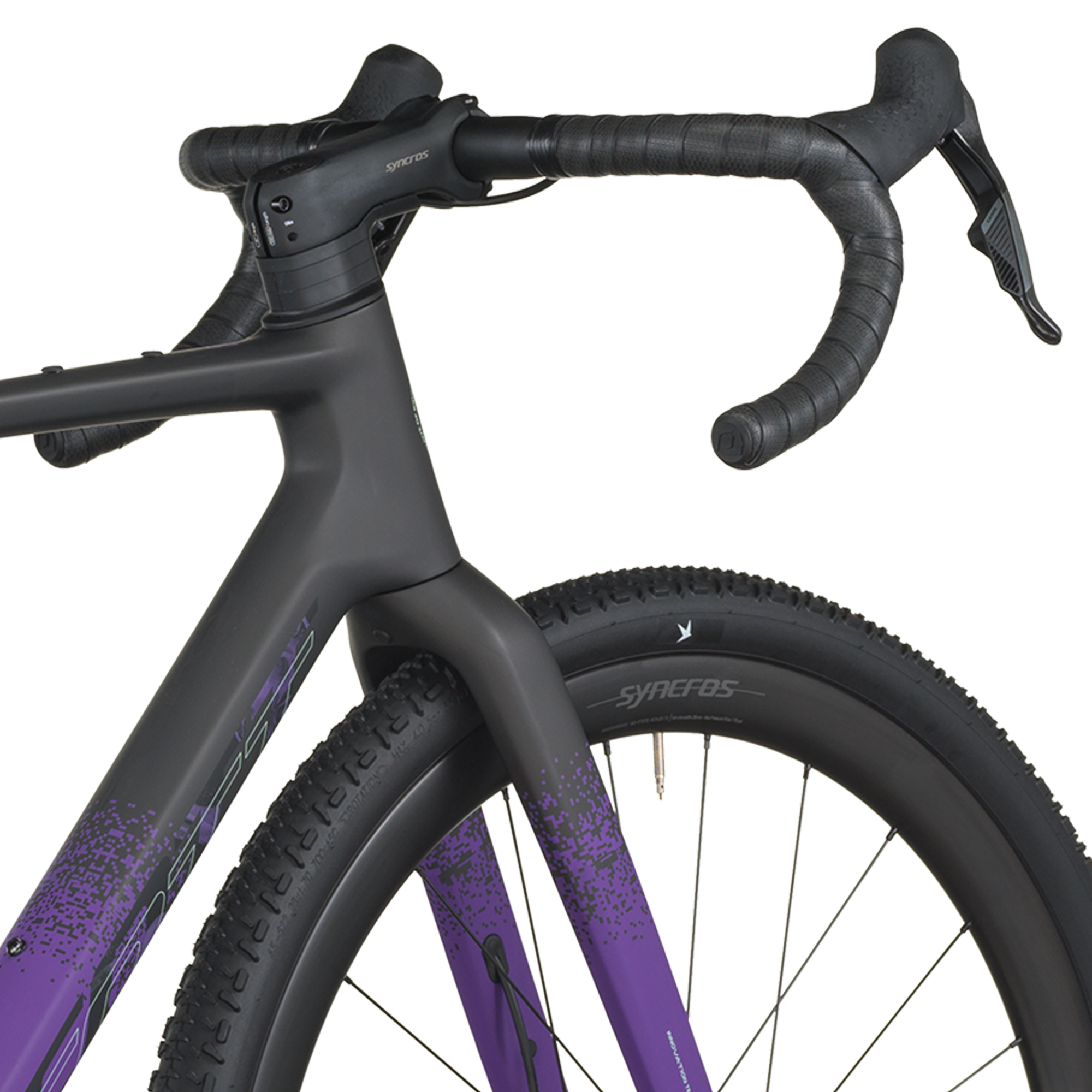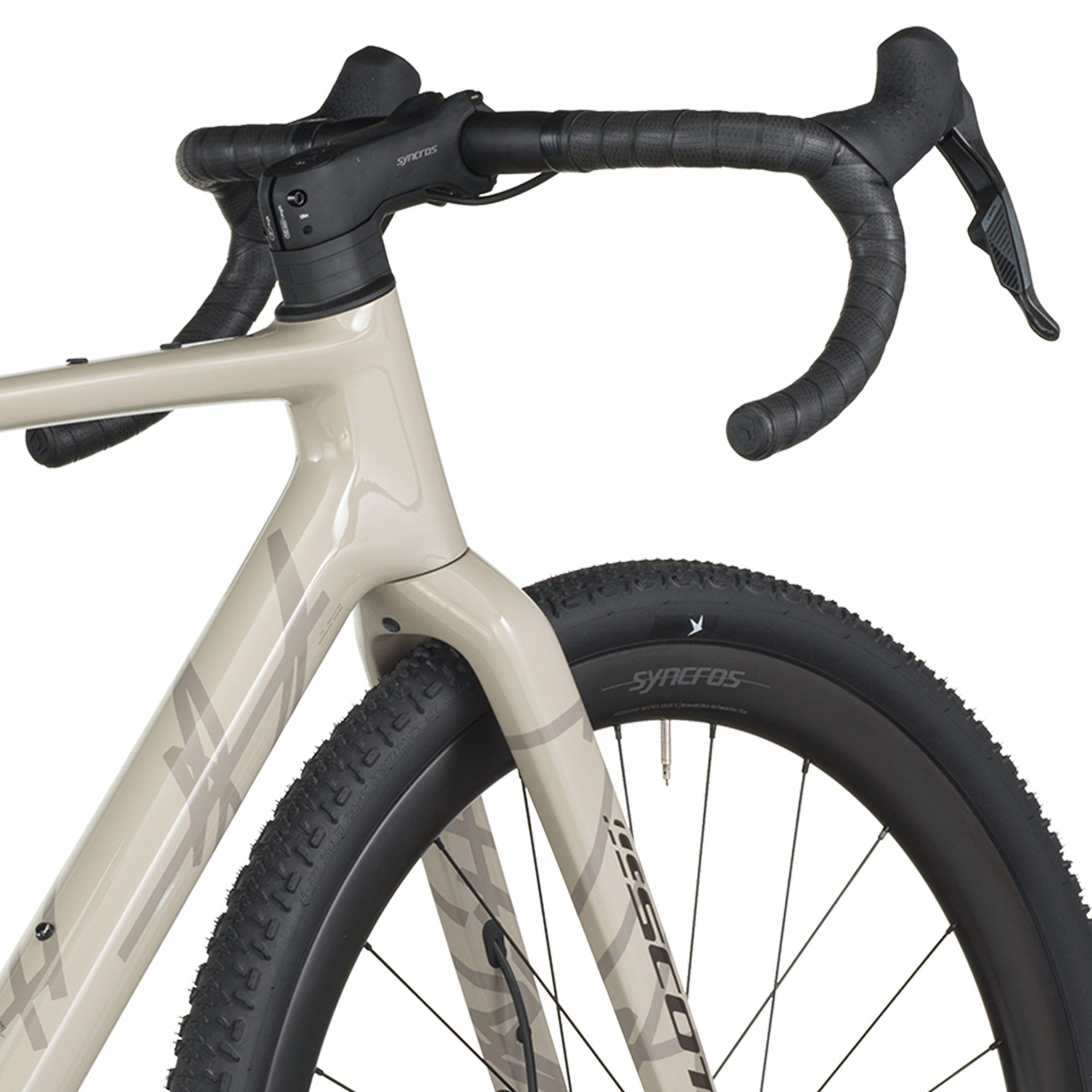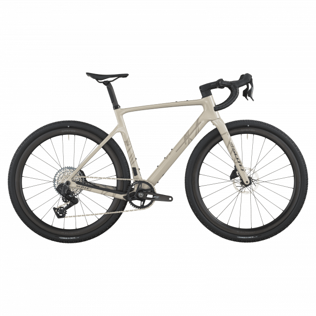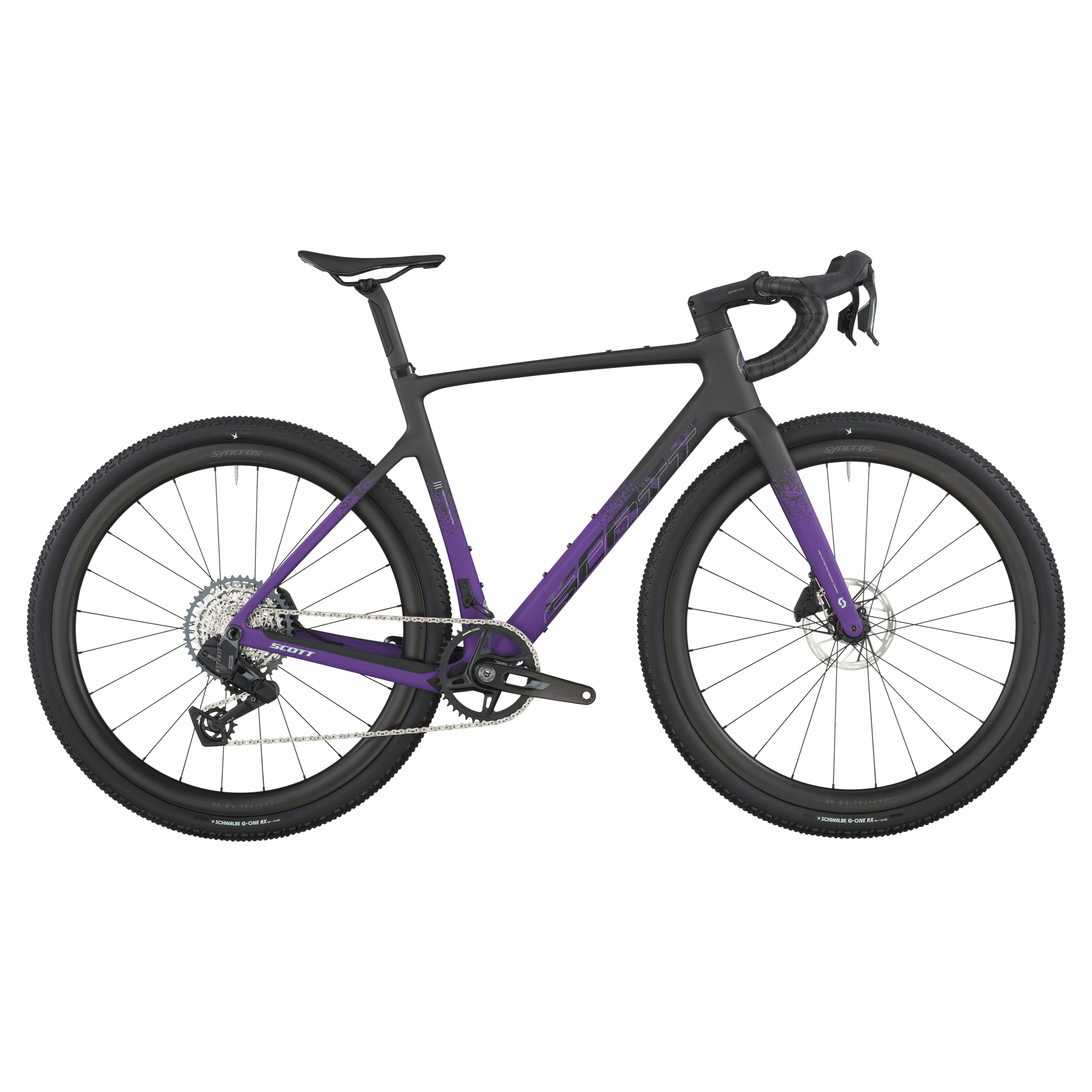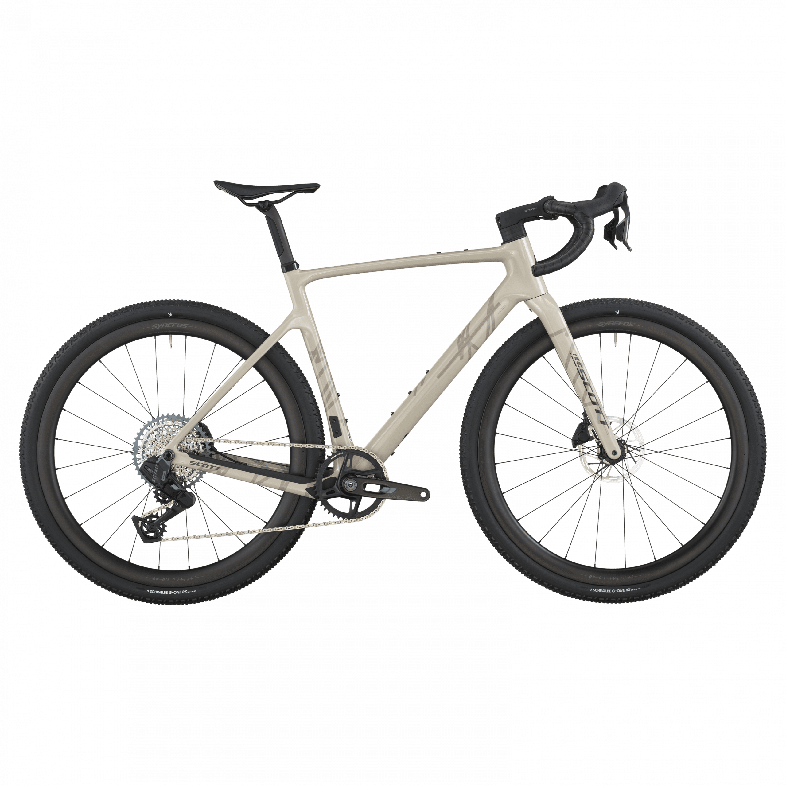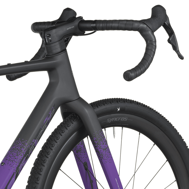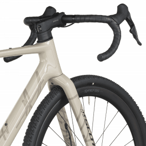 Les roues Syncros Capital 1.0 40 (carbone) sont montées de pneus Schwalbe G-One Bite Performance 700×45C tubeless-ready, assurant grip, confort et polyvalence quel que soit le terrain.