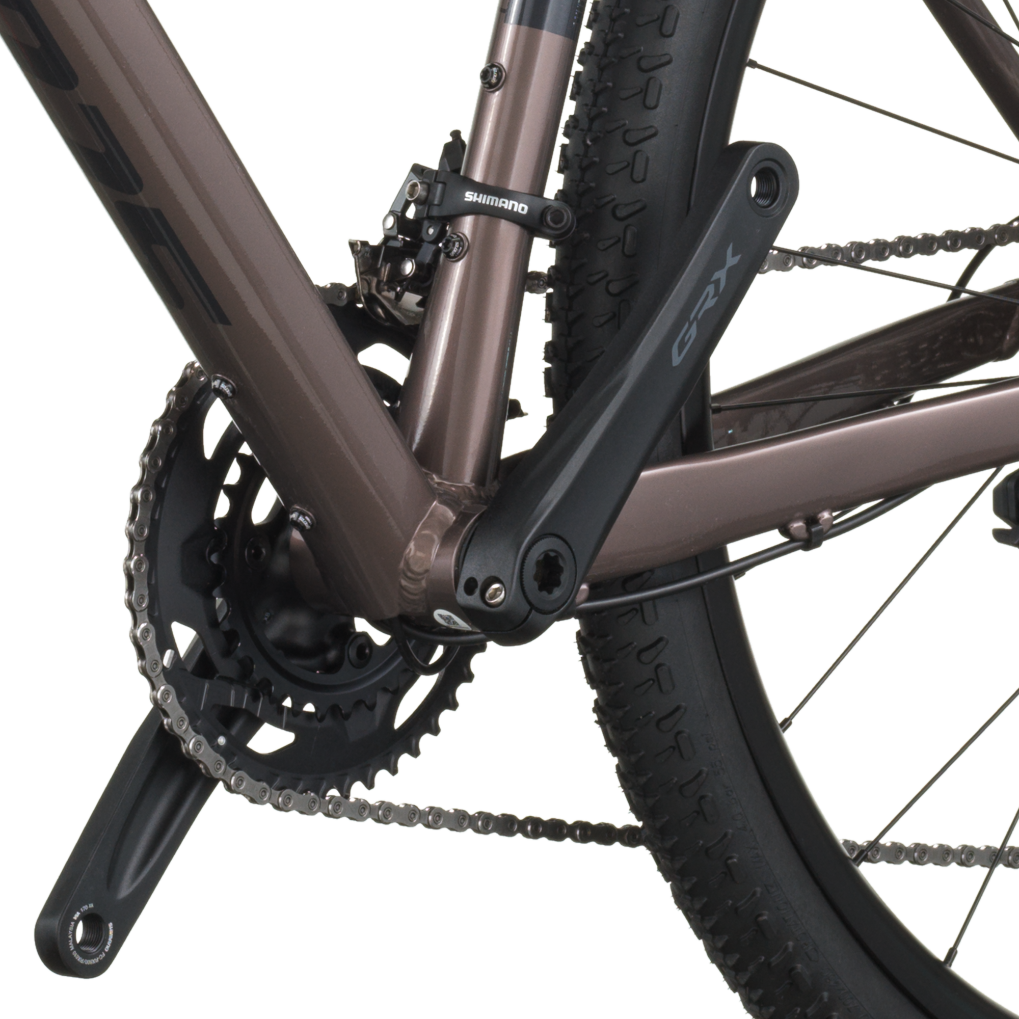 La transmission est une Shimano GRX 2×12 vitesses (manettes ST-RX610 Disc, dérailleurs GRX RD-RX820 / FD-RX820-F, pédalier GRX FC-RX610-2 46-30 et cassette 11-36), offrant une large plage de développements pour relances fluides comme pour montées variées.