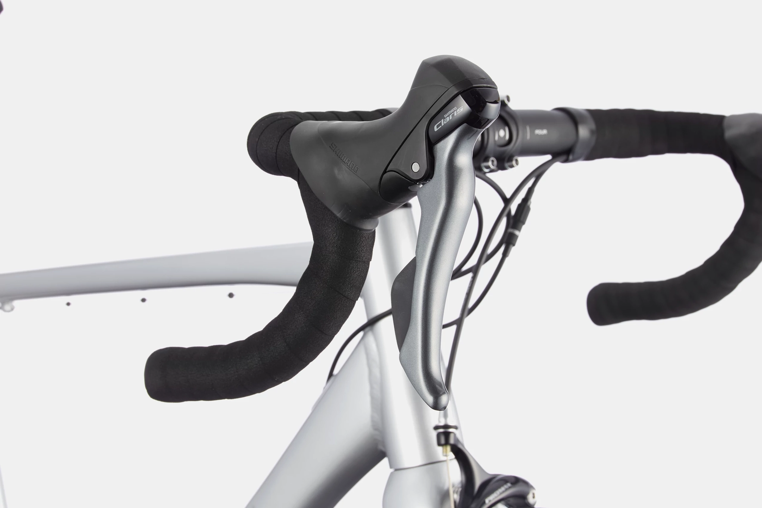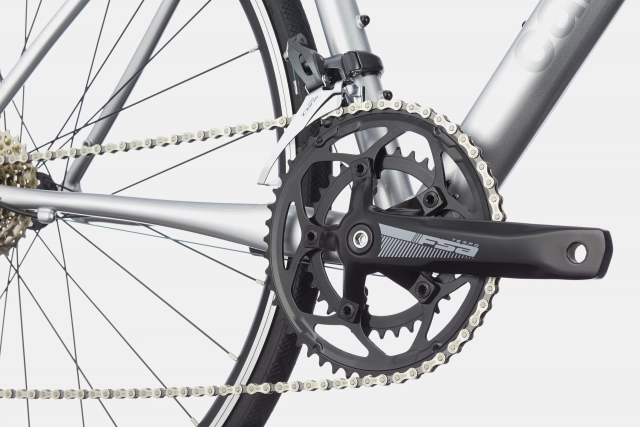 La transmission s’appuie sur un groupe Shimano Claris 8 vitesses, combiné à des pédaliers FSA Tempo 50/34 et une cassette Shimano HG50 11-30T, offrant une plage de développements polyvalente adaptée aux montées, relances et profils roulants.