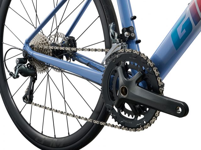 La transmission est assurée par le groupe Shimano Tiagra 2×10 vitesses, avec un pédalier compact 50/34 et une cassette 11-34, offrant une large plage de développements adaptée aussi bien aux parcours vallonnés qu’aux sorties rapides sur le plat.