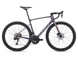 Les roues sont les Giant SLR 2 40 WheelSystem carbone montées de pneus tubeless Giant Gavia Fondo, 700×32c (≈ 33,5 mm effectifs), prêt à accepter jusqu’à 38-40 mm selon dégagements : confort, roulage, polyvalence.