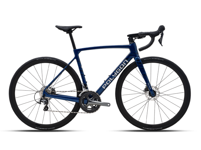 Les roues sont des jantes “Polygon RD6 Disc” (24 rayons) montées de pneus Schwalbe One Addix 700×28C tubeless‑ready : bon compromis entre rendement, légèreté et polyvalence.