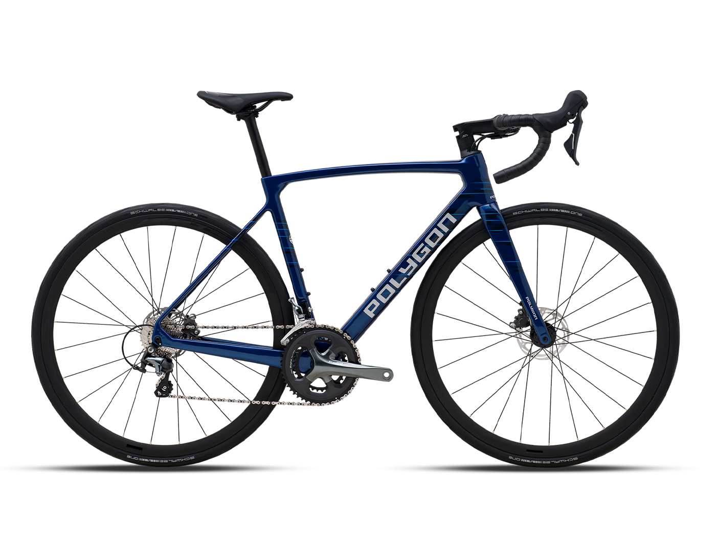 Les roues sont des jantes “Polygon RD6 Disc” (24 rayons) montées de pneus Schwalbe One Addix 700×28C tubeless‑ready : bon compromis entre rendement, légèreté et polyvalence.