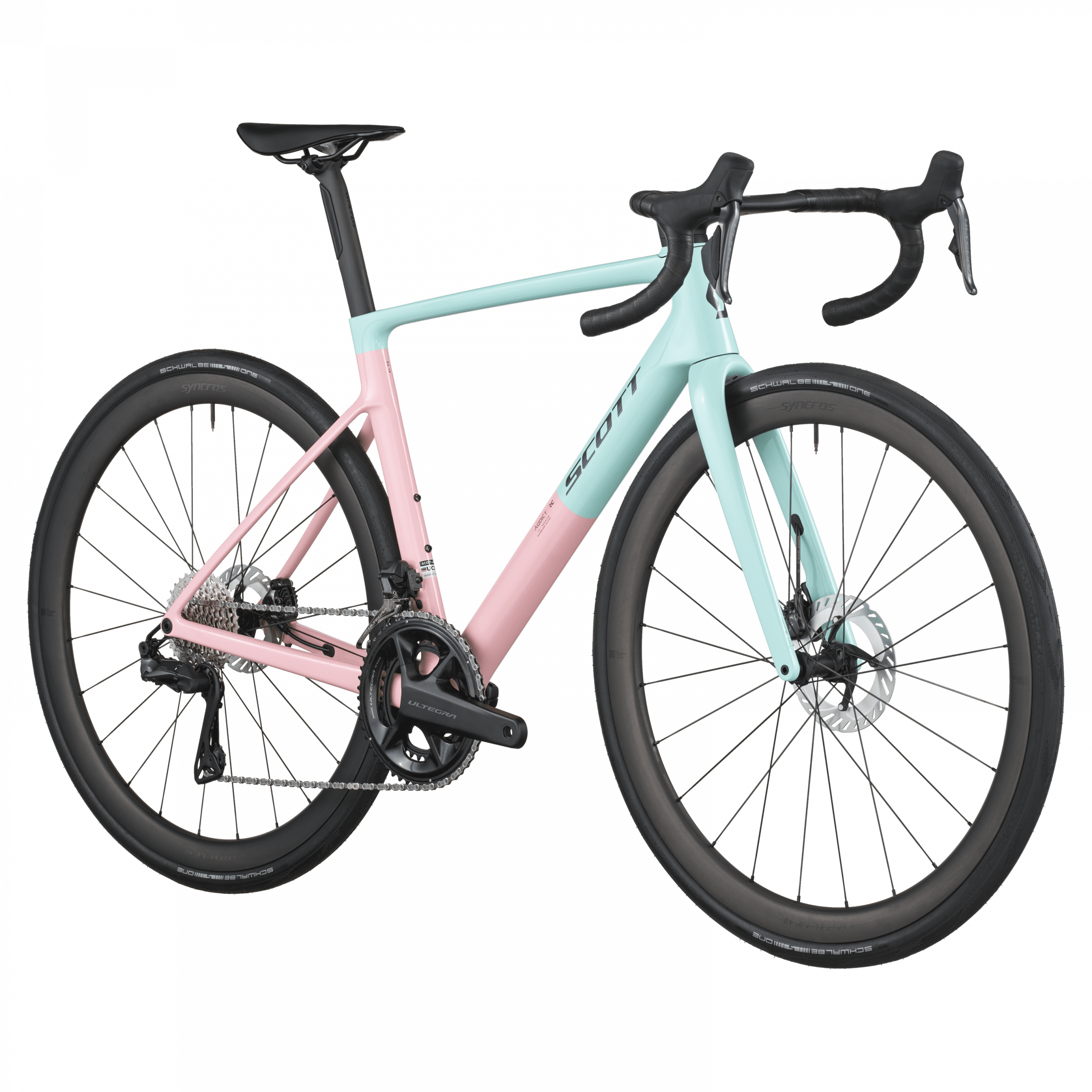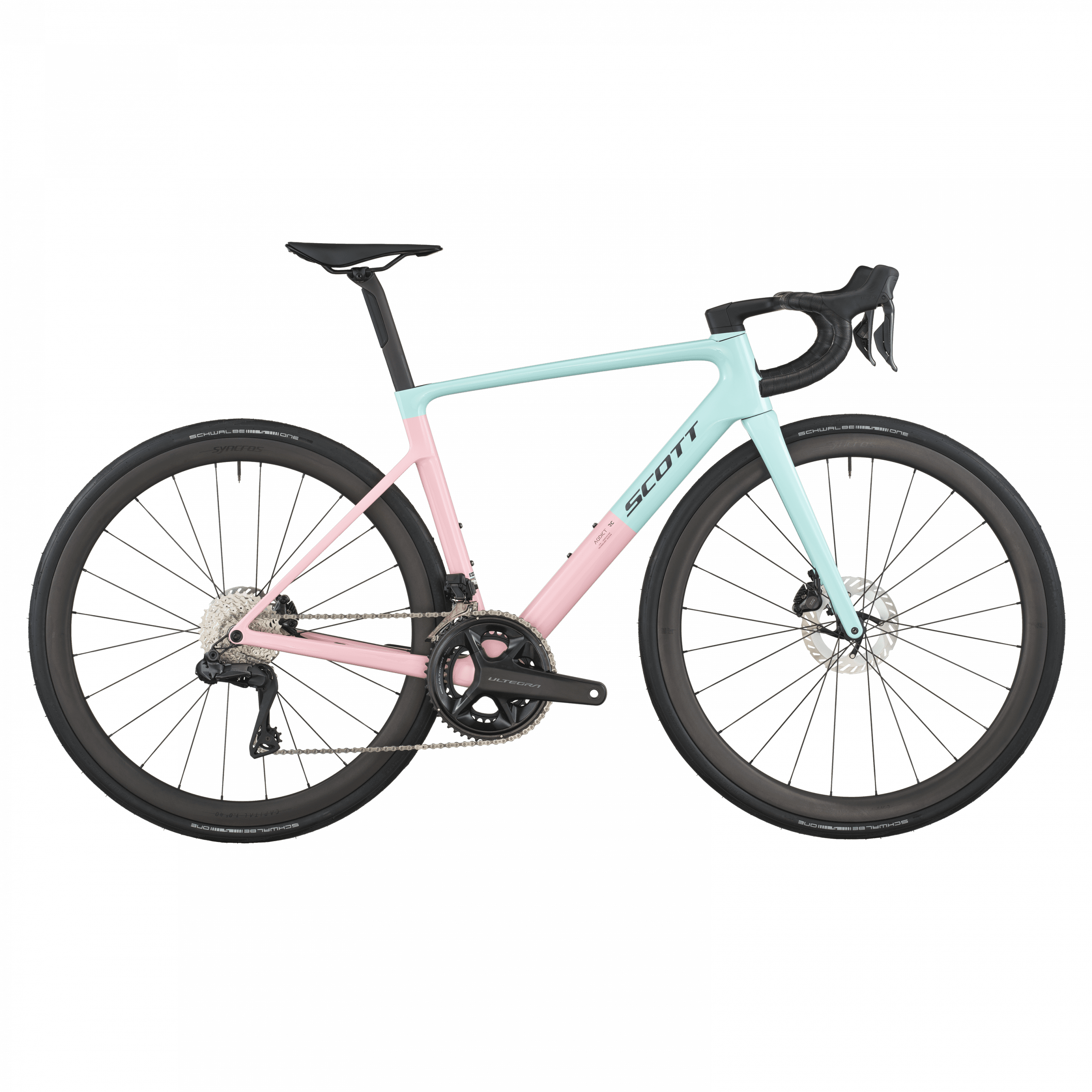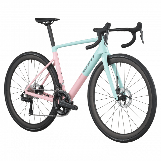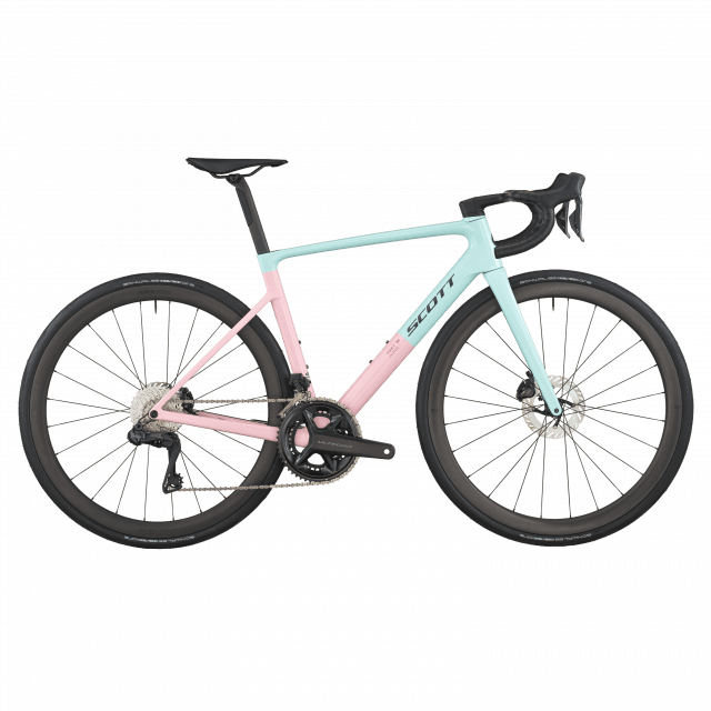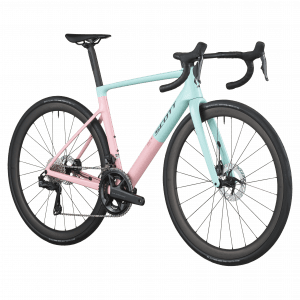 Il est équipé d’une transmission Shimano Ultegra Di2 2×12 vitesses (manettes ST-R8170, dérailleurs FD/RD-R8150) offrant des changements électroniques rapides et fiables, idéale pour les efforts soutenus en montée ou en sprint.