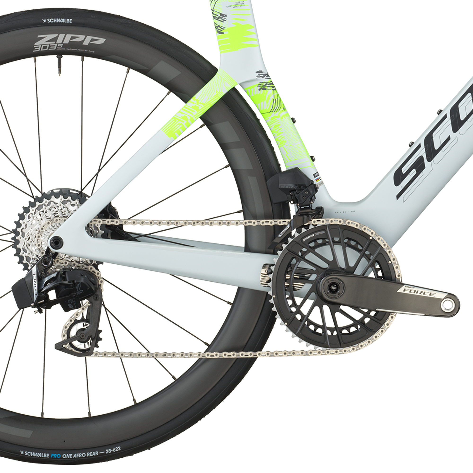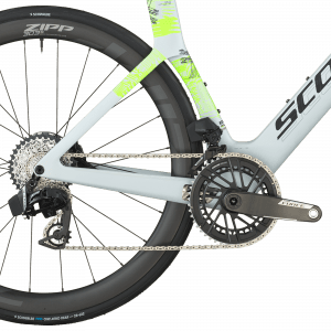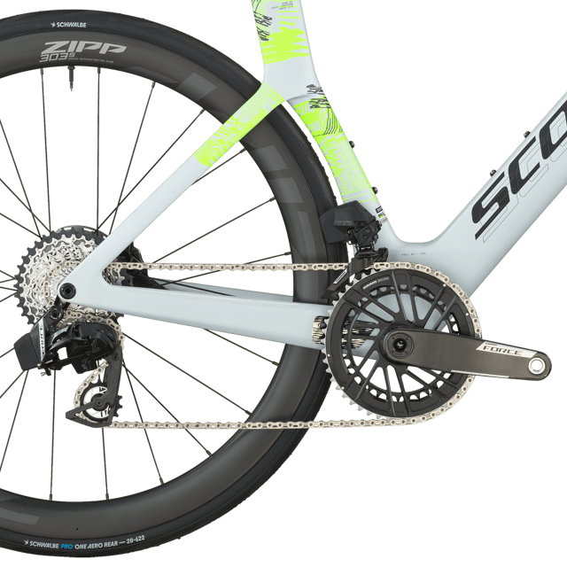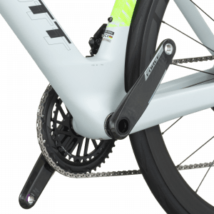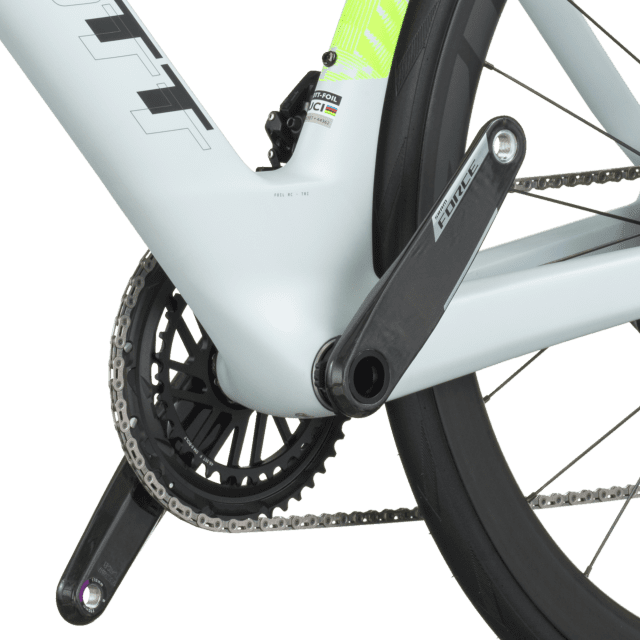 Il est équipé d’une transmission électronique sans fil SRAM Force AXS 24 vitesses (leviers eTap AXS Wireless Blips, pédalier 48/35 et cassette 10‑36) offrant des changements ultra‑précis et adaptés aux efforts soutenus propres aux épreuves chronométrées.