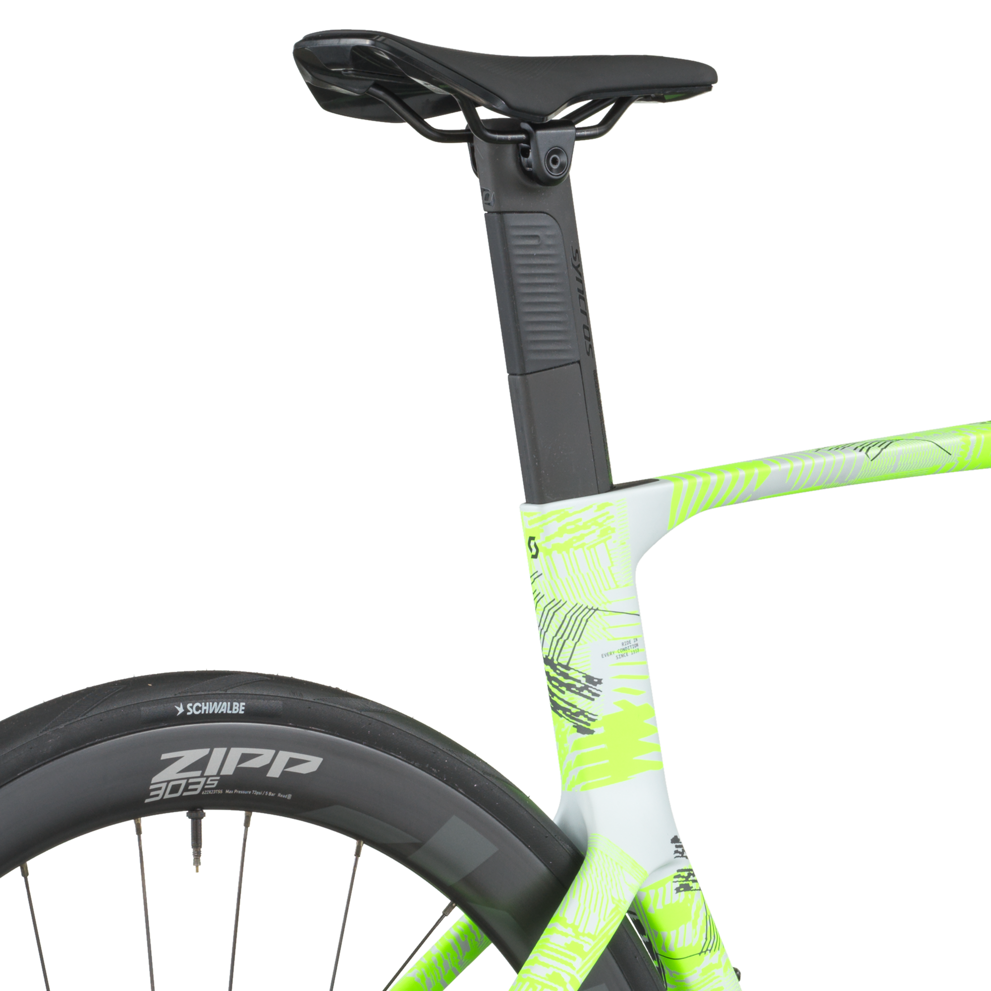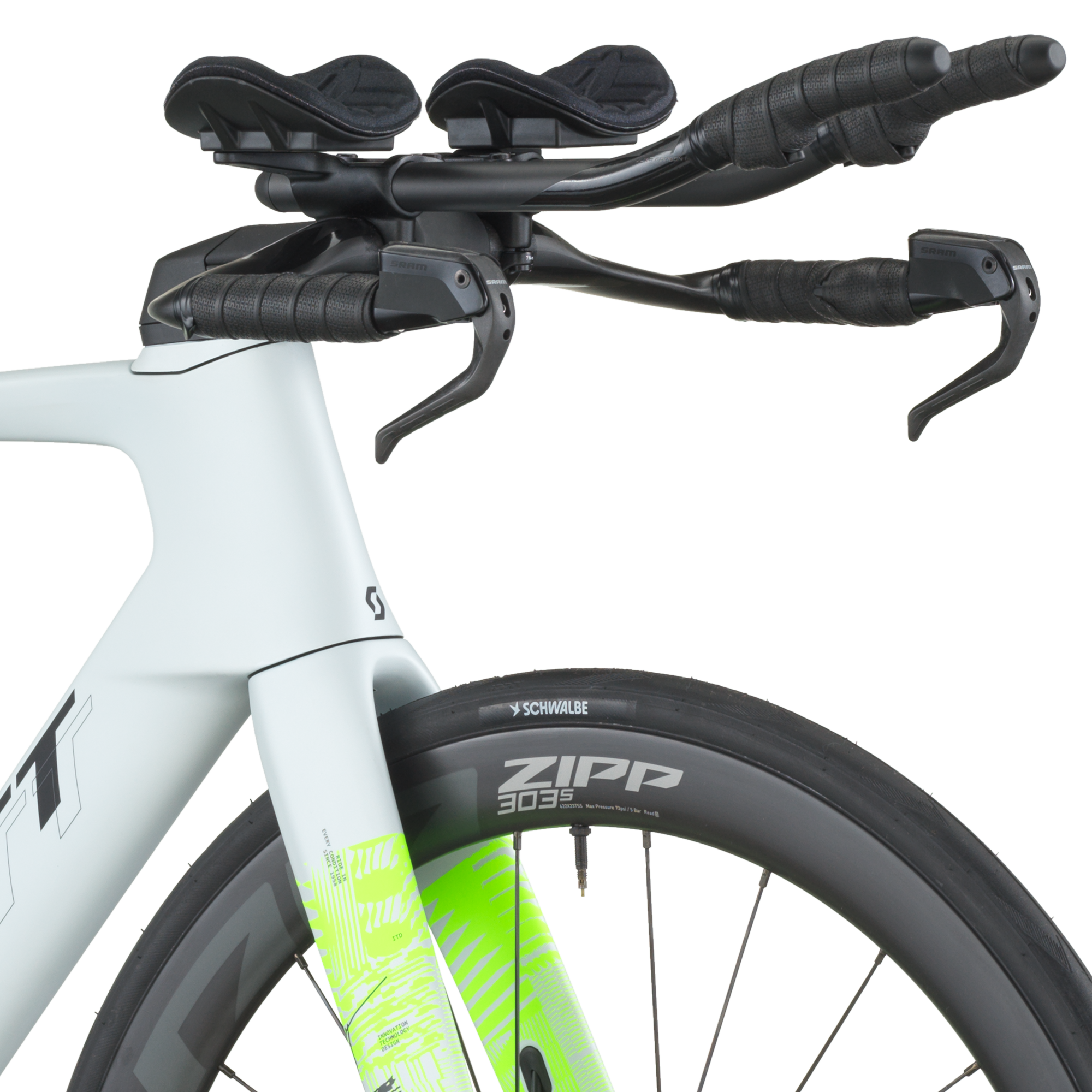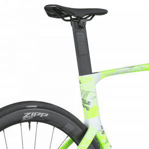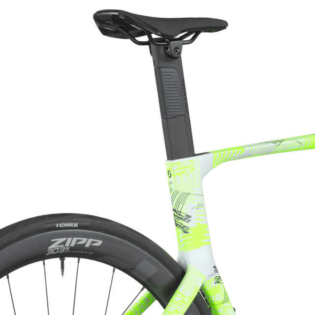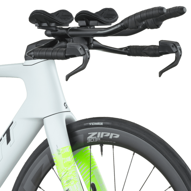 Les roues ZIPP 303S en carbone tubeless‑ready associées à des pneus Schwalbe PRO ONE Aero 700×28 C et un poste de pilotage ZIPP VUKA Bull + extensions carbone VUKA EVO offrent un excellent compromis entre aérodynamisme, rendement et stabilité à haute vitesse.
