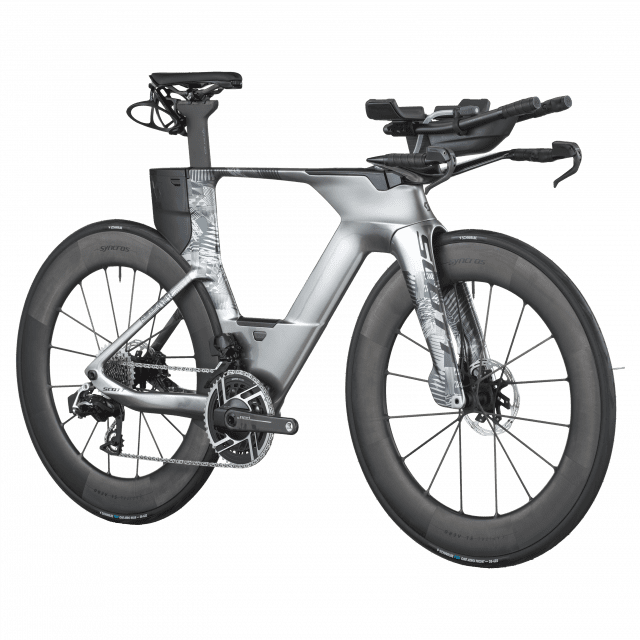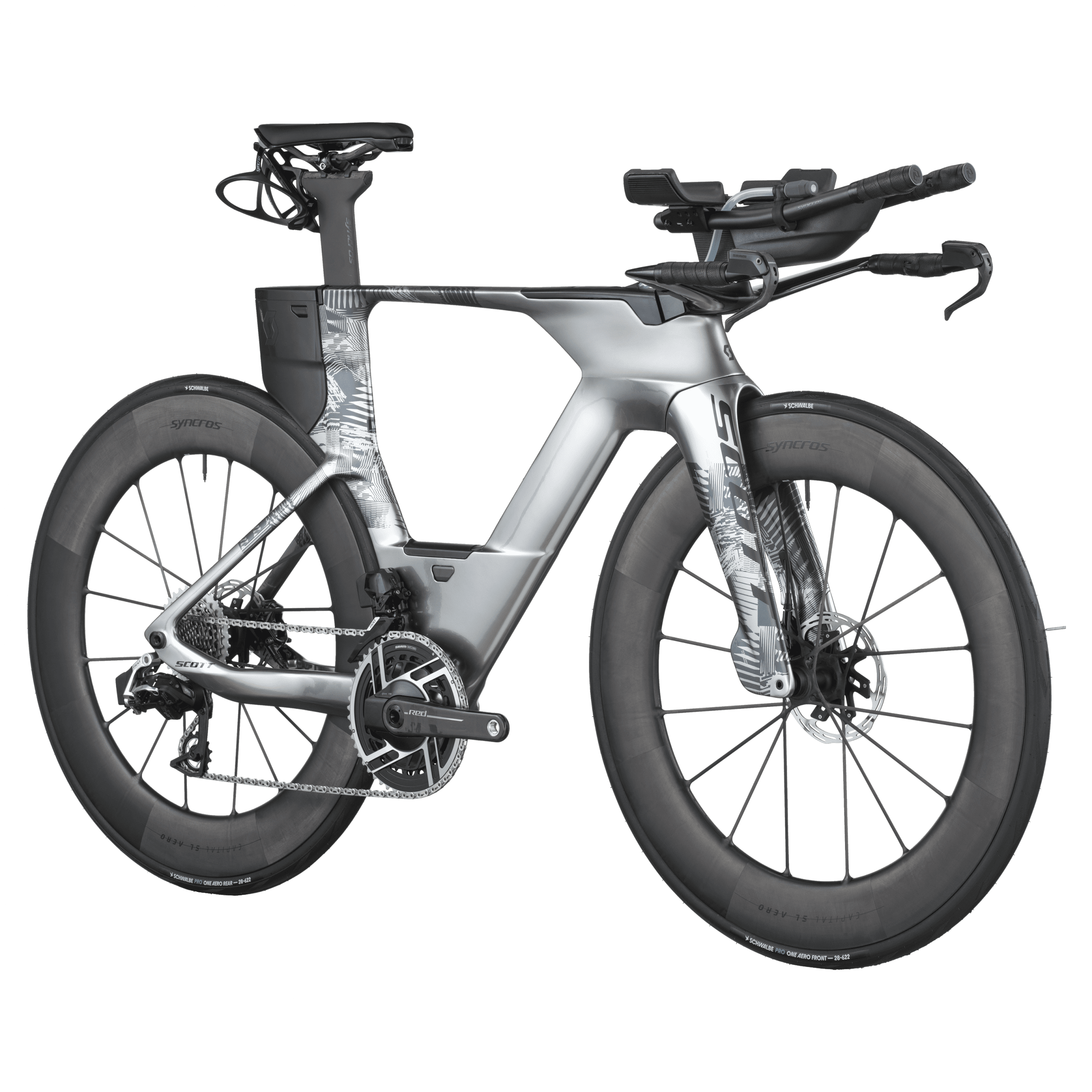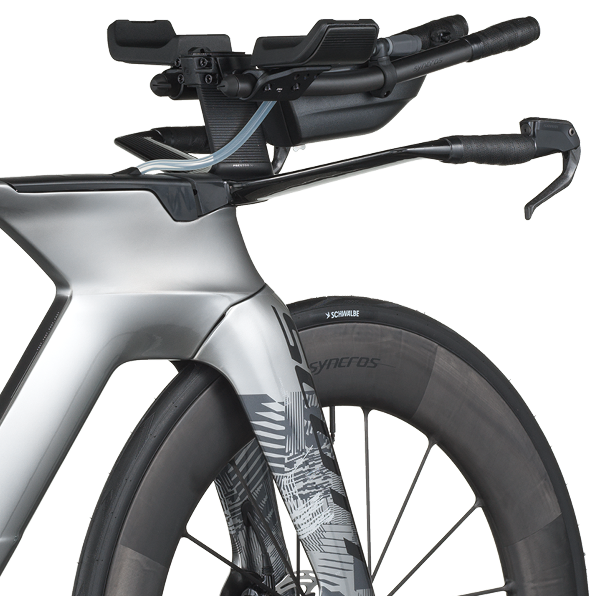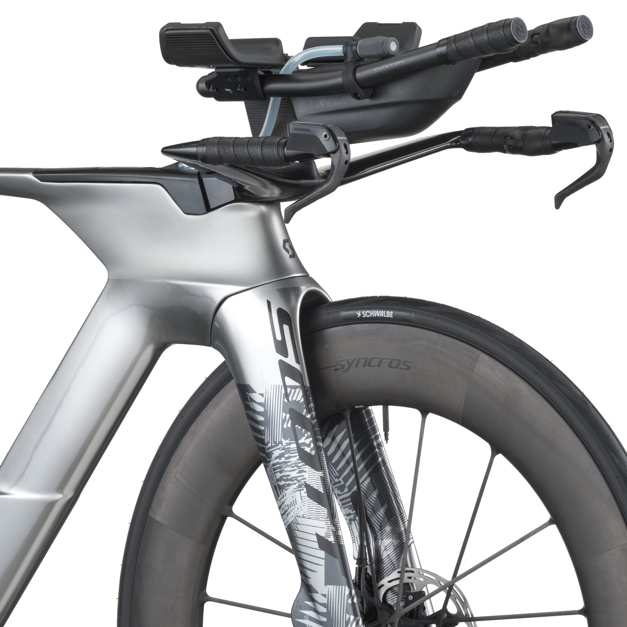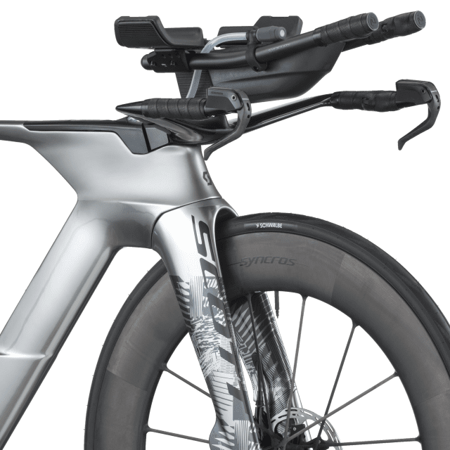 Le freinage est assuré par des étriers SRAM S900 HRD à disque (flat‑mount) avec rotors Paceline de 160 mm, offrant puissance et modulation stables même à haute vitesse, tandis que le cockpit Syncros Creston iC TRI avec extensions carbone optimise position et confort aérodynamique.