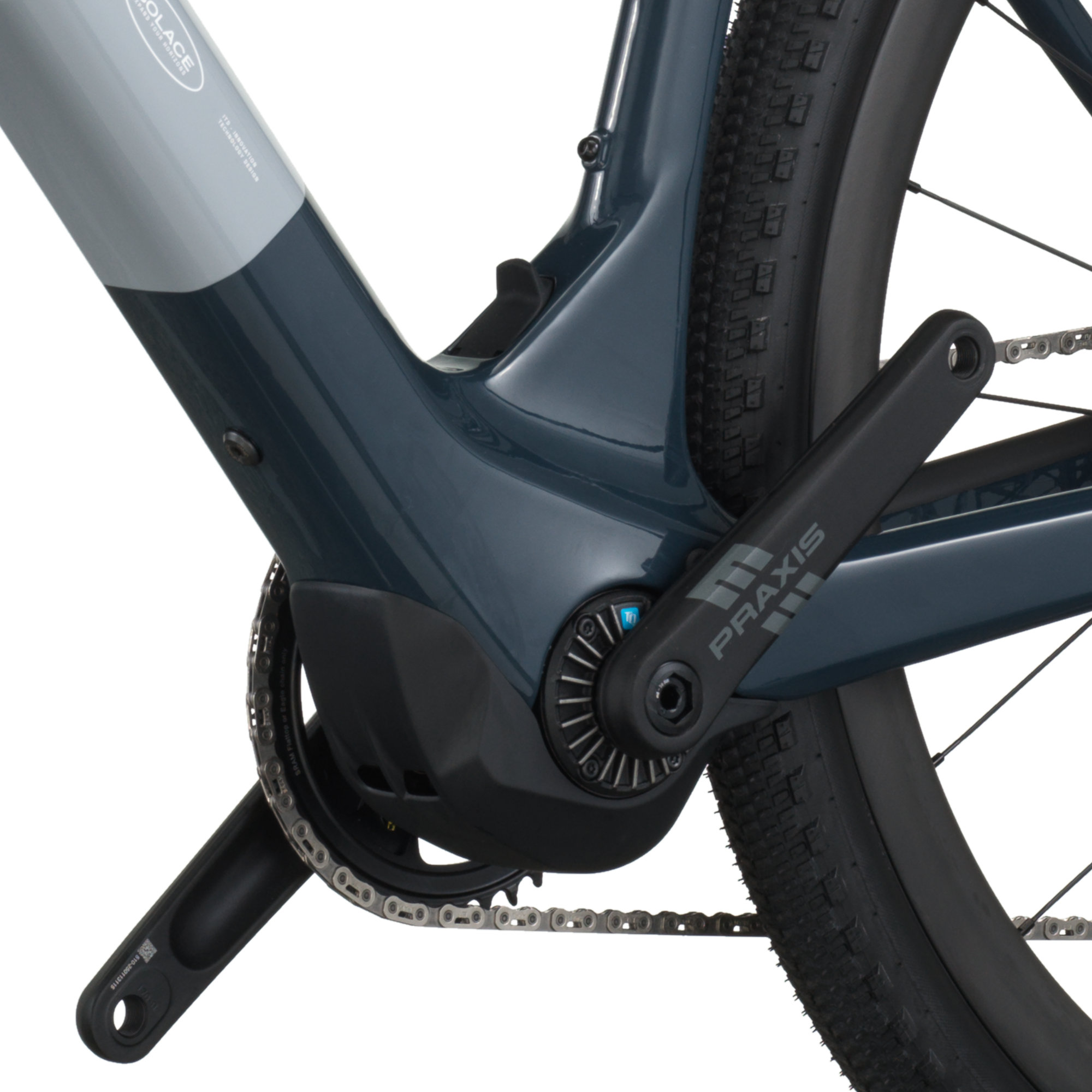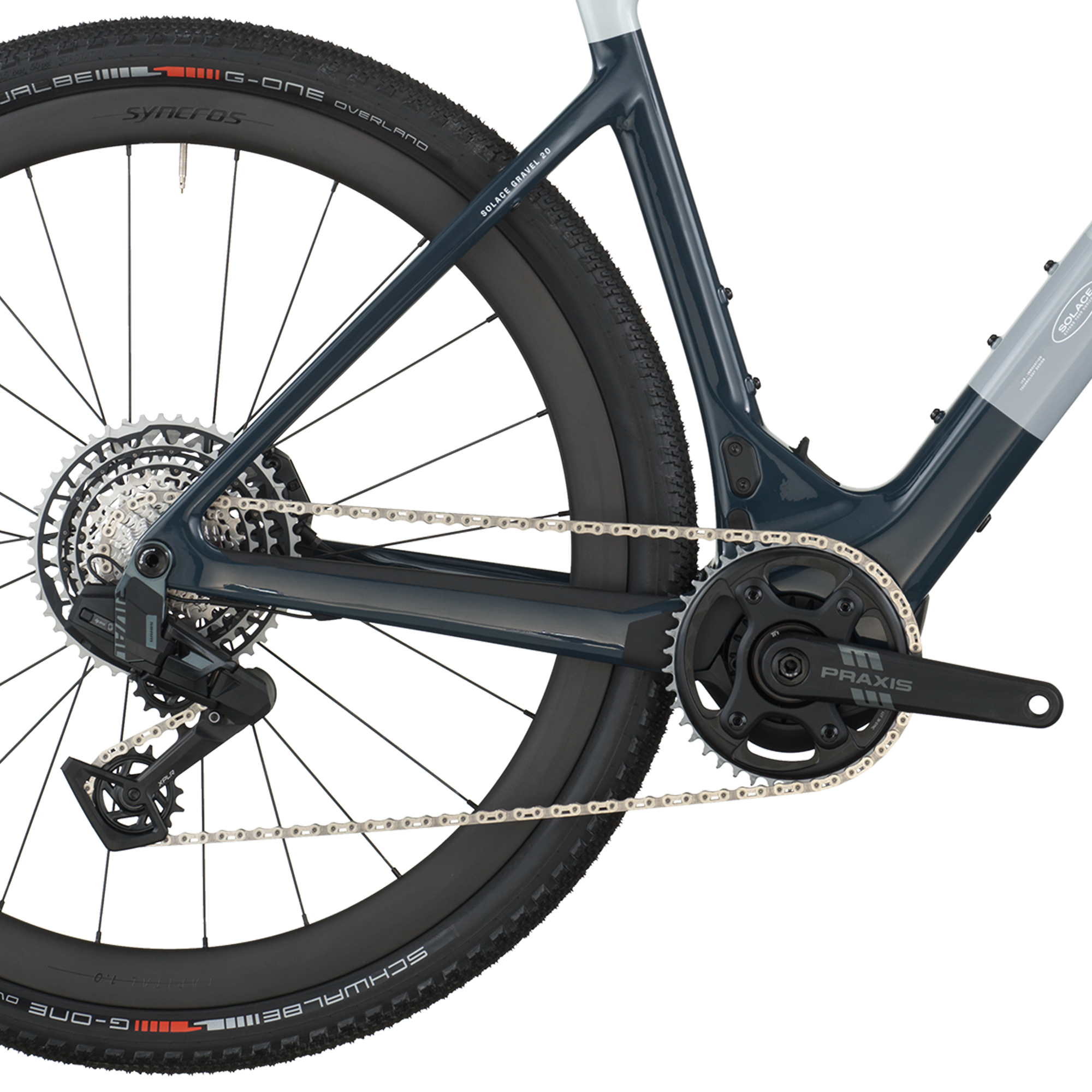 La transmission est une SRAM Rival XPLR eTap AXS 13 vitesses sans fil (leviers + dérailleur + cassette 10-46), associée à un pédalier Praxis TQ 42 T, pour des changements précis et une large plage de développements adaptée aux terrains variés.