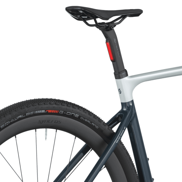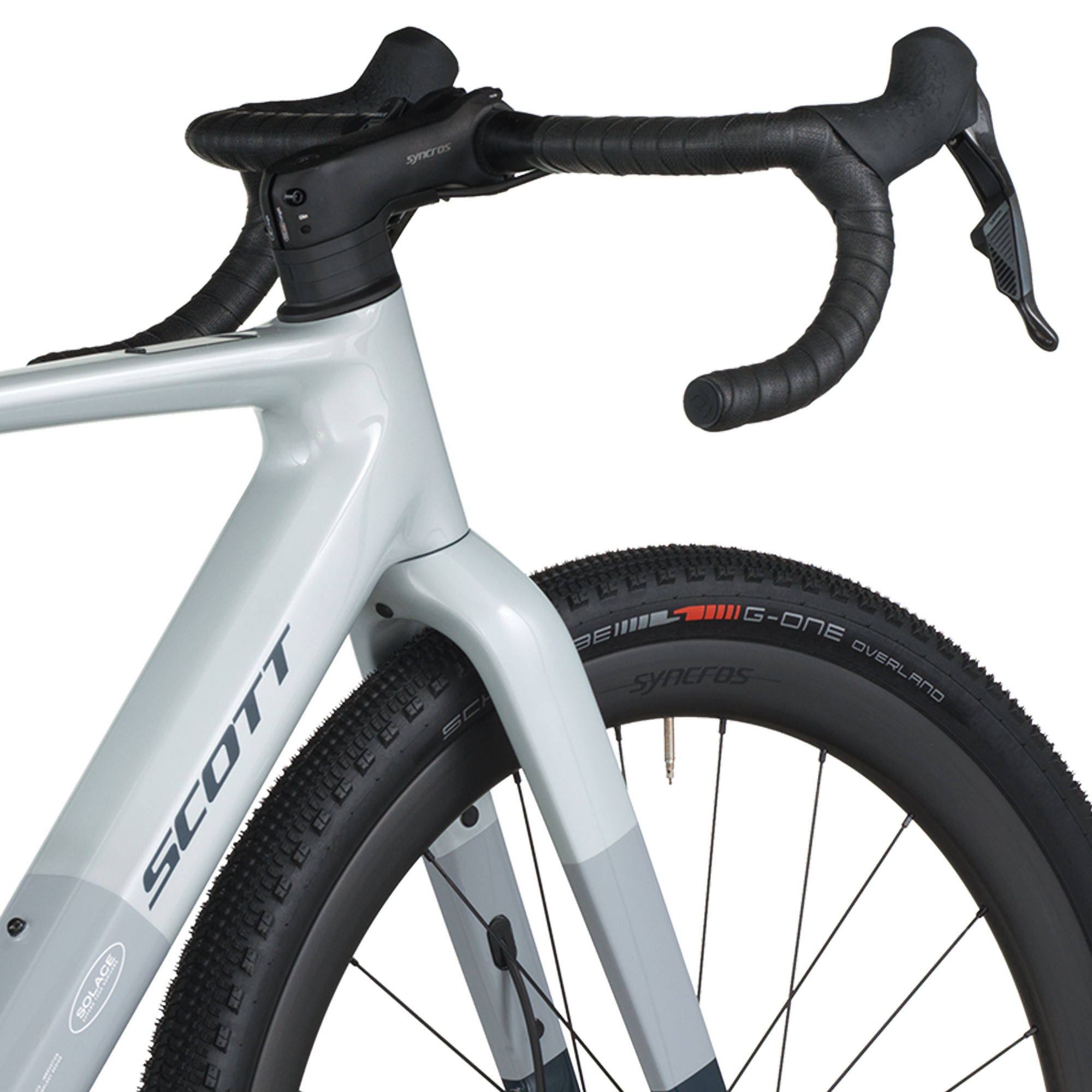 Le freinage est assuré par des freins hydrauliques SRAM Rival eTap AXS HRD (Flatmount, rotors 160 mm), tandis que les components Syncros (guidon Creston 1.0 X carbone, potence RR2.0, tige de selle Duncan) et les roues Syncros Capital 1.0 40e Disc avec pneus Schwalbe G-One Overland EVO 700×50 C offrent confort et traction sur asphalte ou pistes.