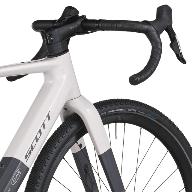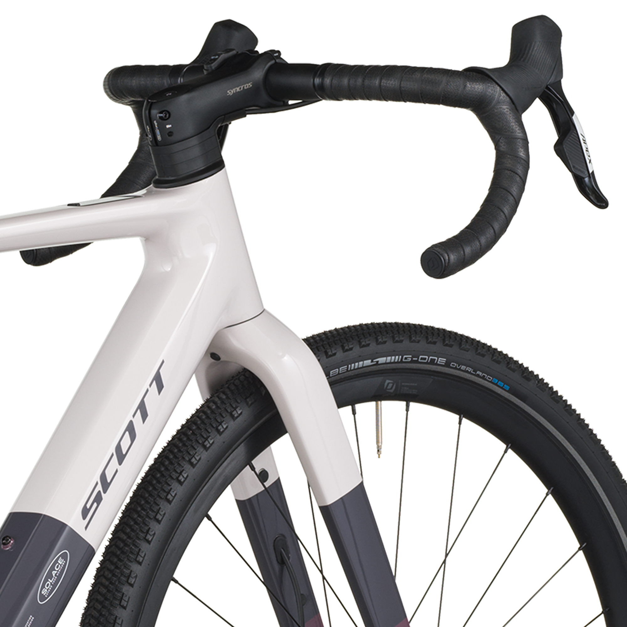 Le freinage hydraulique SRAM APEX AXS HRD avec rotors HS2 160 mm avant et arrière, les roues Syncros Capital 2.0 Disc et pneus Schwalbe G-One Overland 700×50 C tubeless-ready garantissent adhérence, confort et contrôle sur asphalte ou pistes légères.