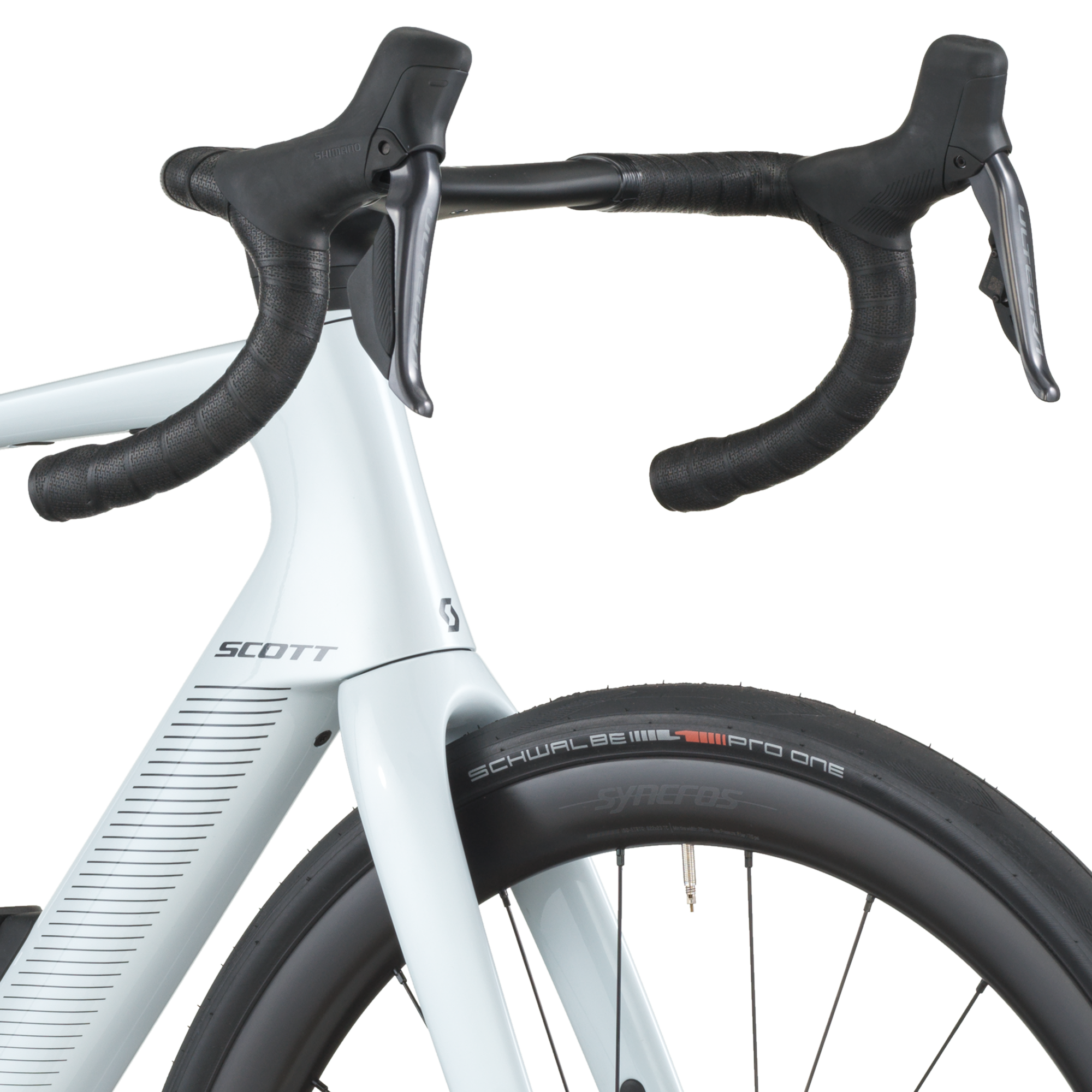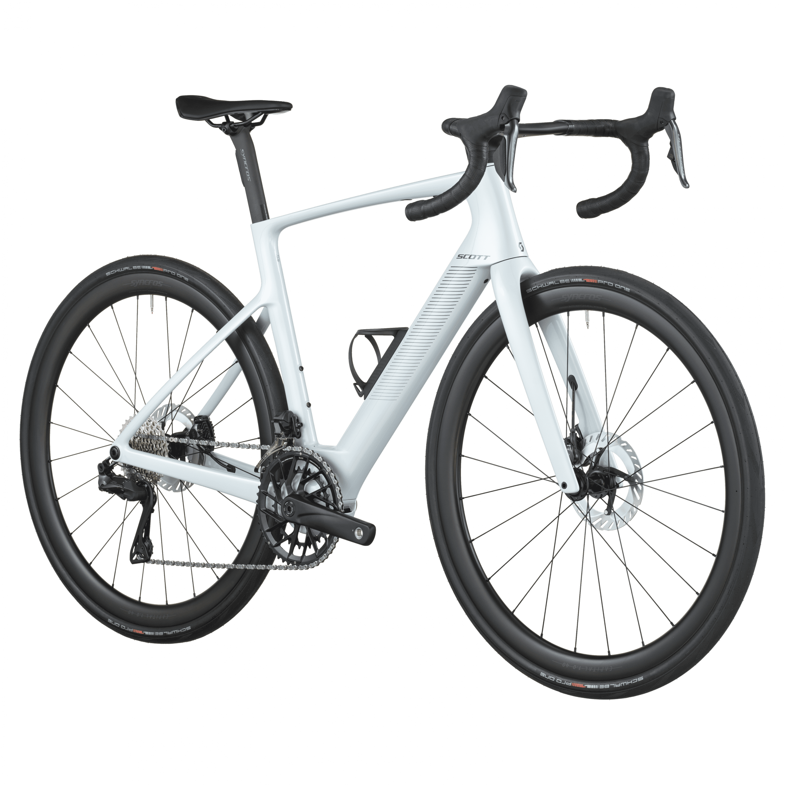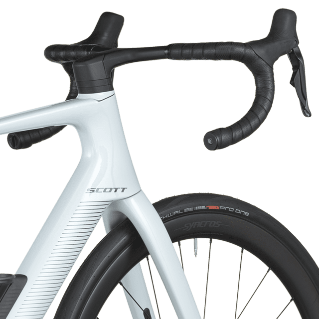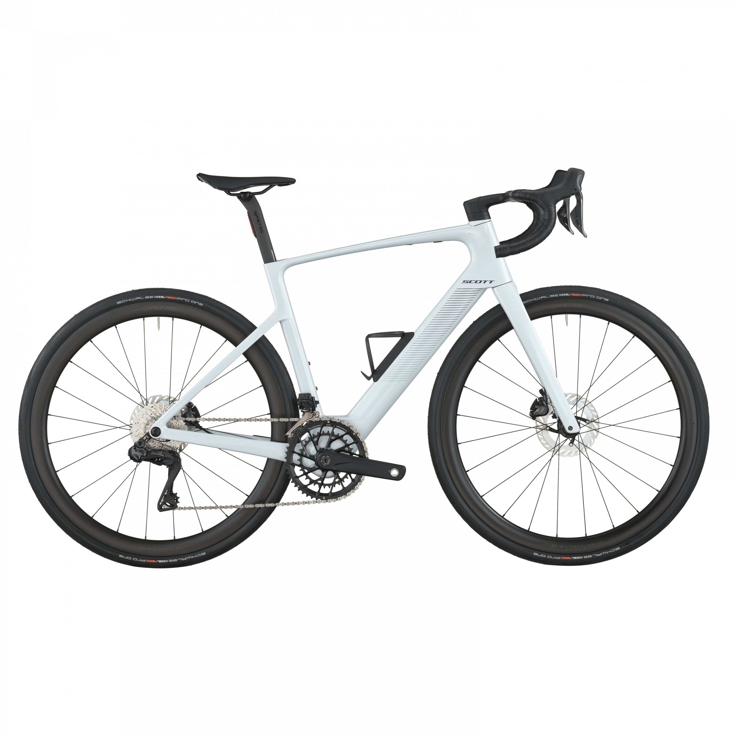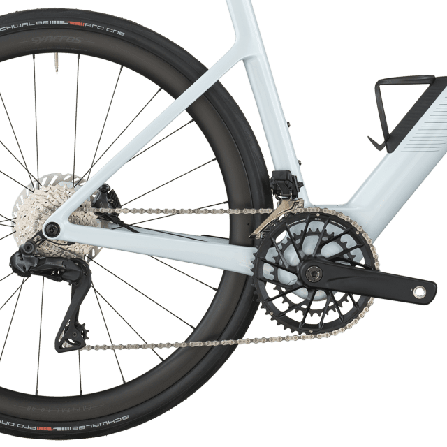 Le freinage Shimano BR-R8170 hydraulique avec rotors Center-Lock (160 mm) est couplé à des roues Syncros Capital 1.0 40 Disc montées de pneus Schwalbe PRO ONE Evo 700×34C, combinant puissance, adhérence et rendement.