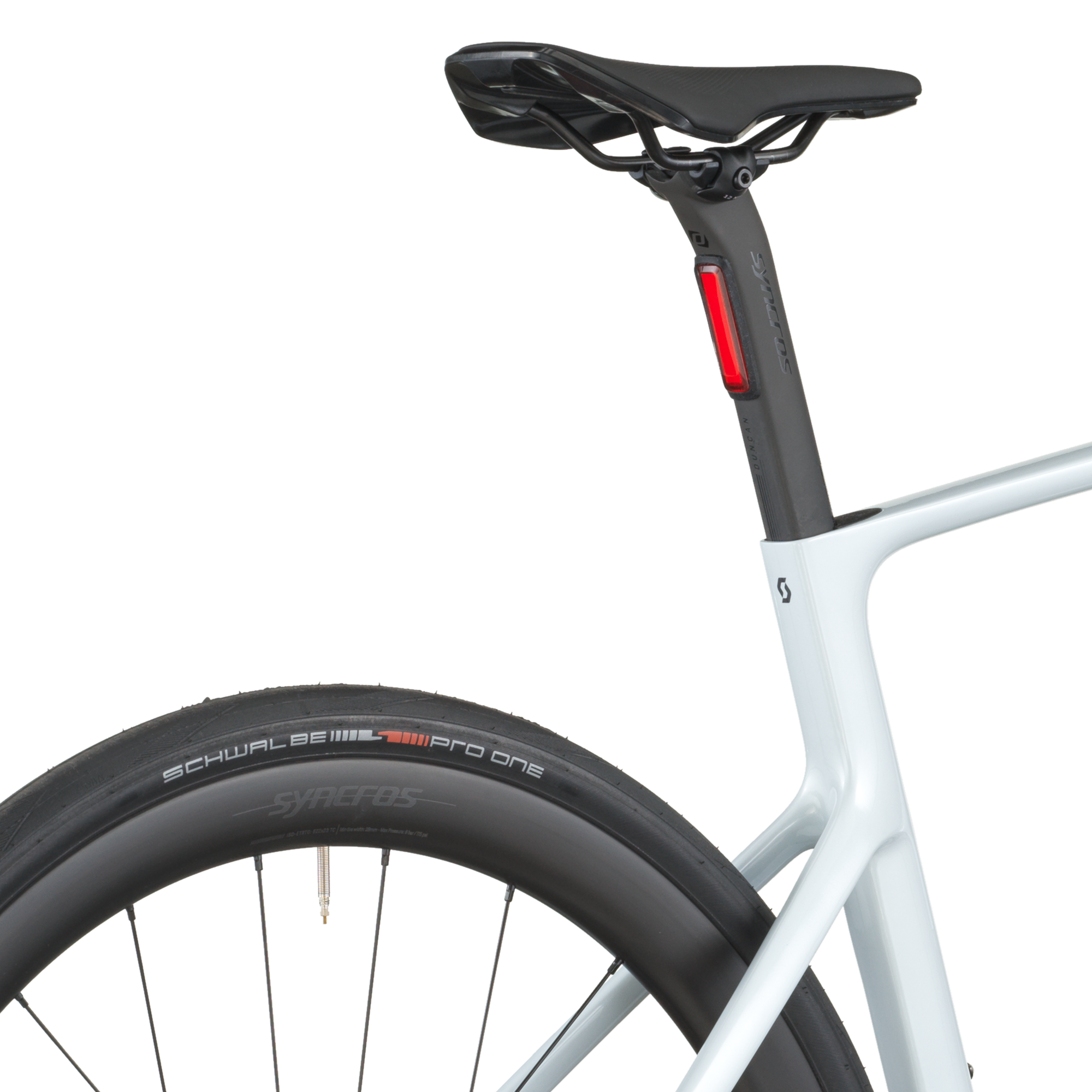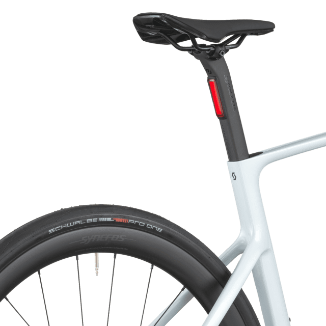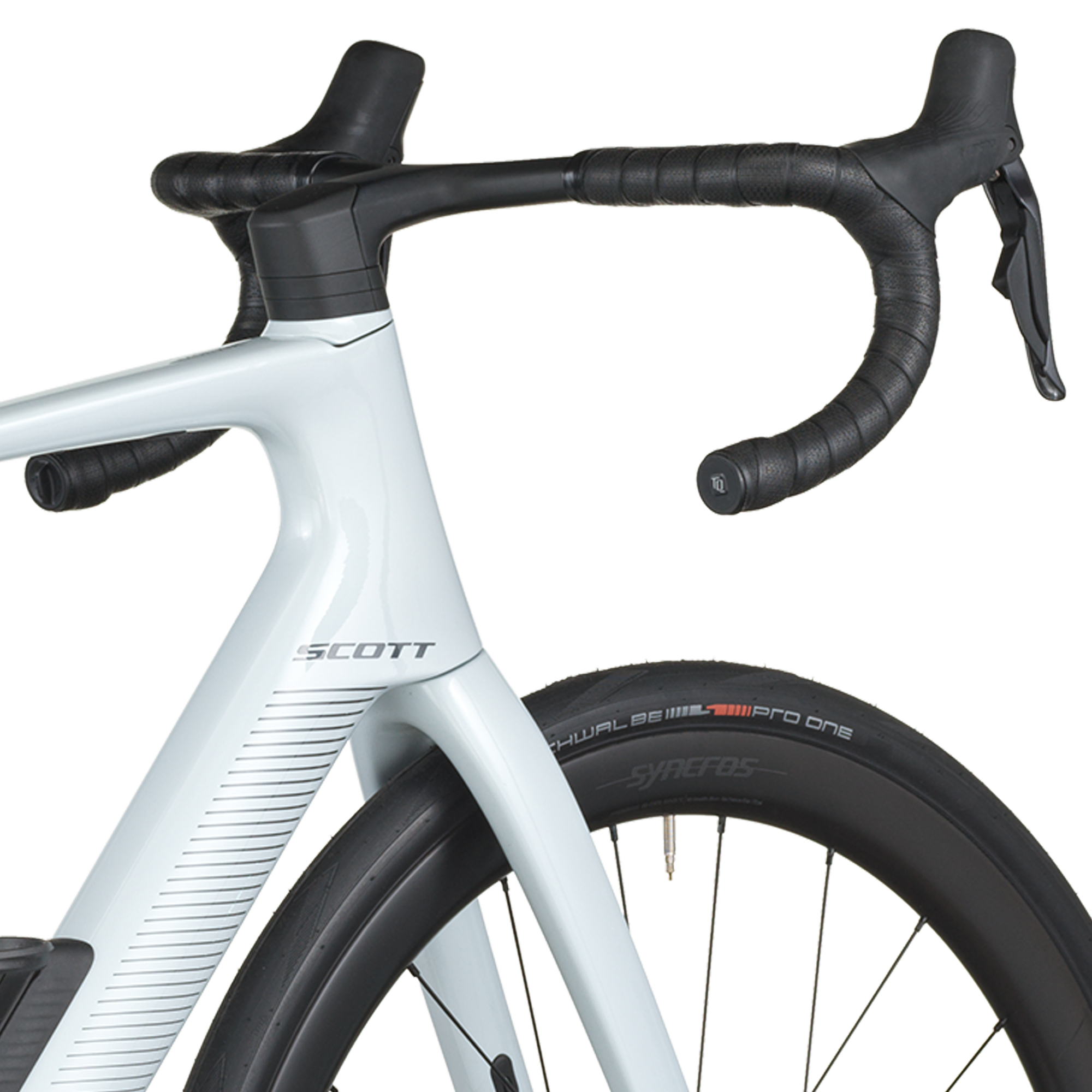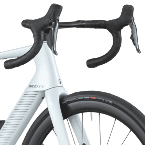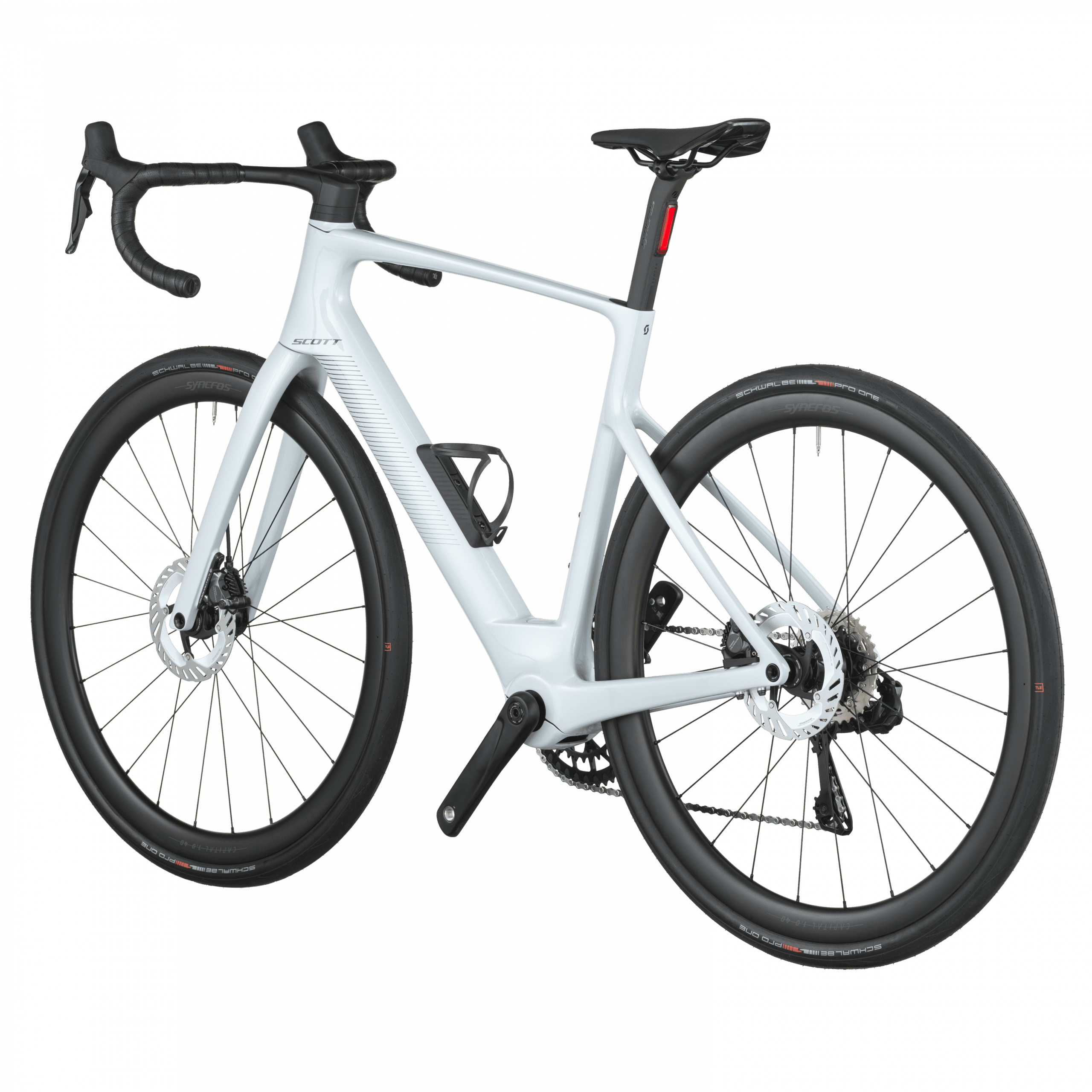 Le freinage Shimano BR-R8170 hydraulique avec rotors Center-Lock (160 mm) est couplé à des roues Syncros Capital 1.0 40 Disc montées de pneus Schwalbe PRO ONE Evo 700×34C, combinant puissance, adhérence et rendement.