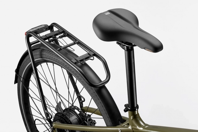 Détails malins pour la ville : poignées ergonomiques / selle Selle Royal, porte-bagages Racktime 2.0 (18 kg) et intégration soignée.