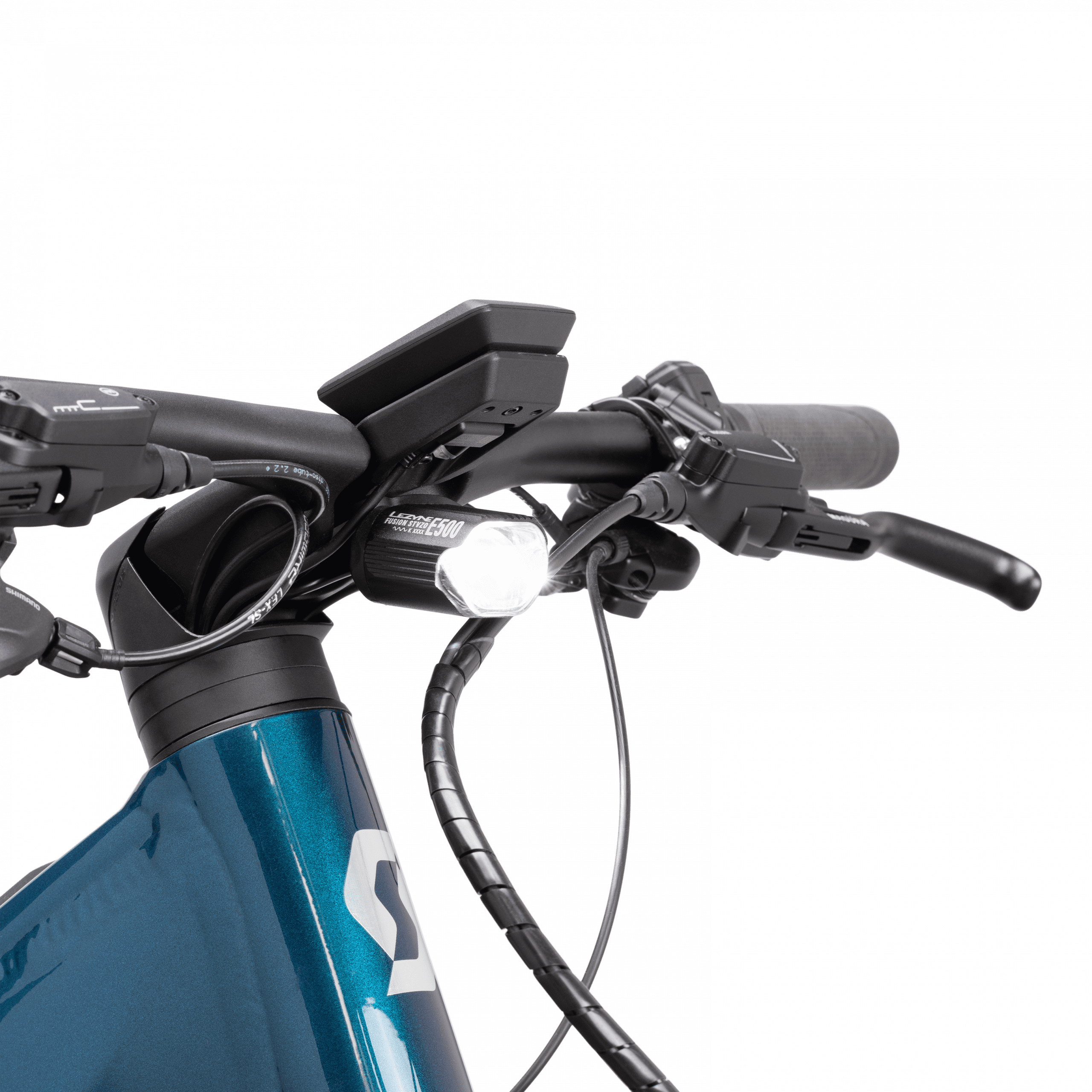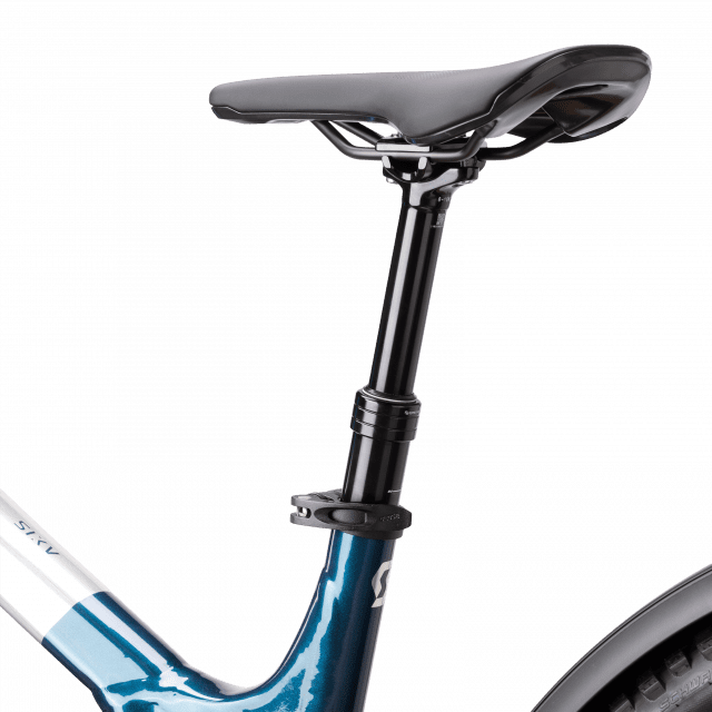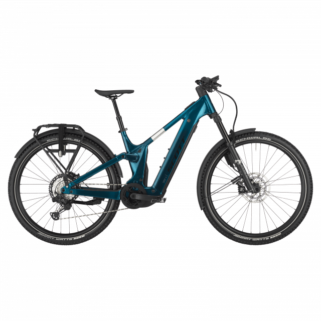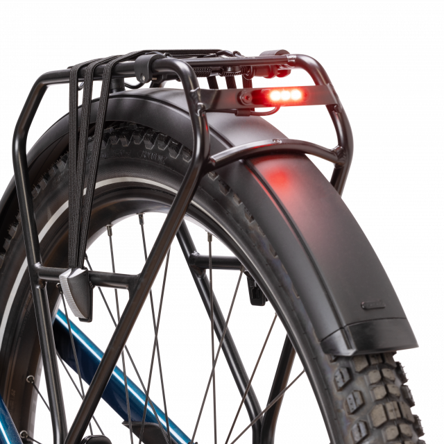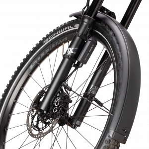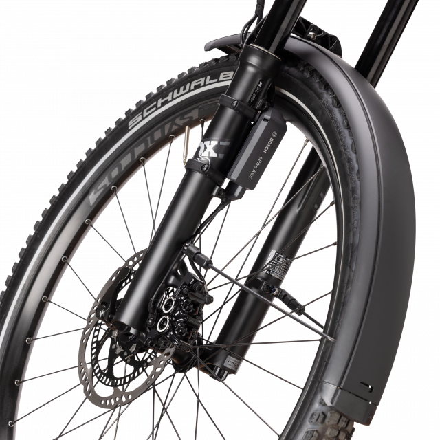 Équipement complet pour les aventures : roues 29″ tubeless-ready Syncros MD30 avec pneus Schwalbe Advancer 60-622, tige de selle télescopique Syncros Duncan 2.5, garde-boues Curana, éclairage avant Lezyne Fusion et arrière Supernova, et porte-bagages Racktime SnapIt 2.0 (15 kg), ce qui fait de l’Axis FS 10 un e-MTB polyvalent, confortable et prêt à affronter terrains difficiles comme trajets pratiques.
