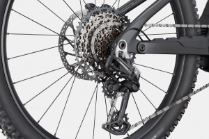 Le Cannondale Moterra LT 1 est un e-VTT long-travel taillé pour les descentes engagées : cadre carbone + aluminium, roues mullet (29″ avant / 27,5″ arrière), 170 mm de débattement avant avec une Fox 38 Performance et 165 mm arrière avec un Fox DHX Performance à ressort.