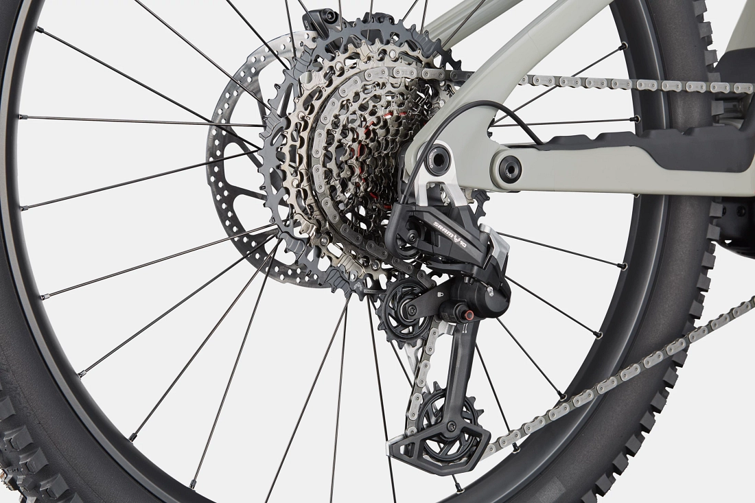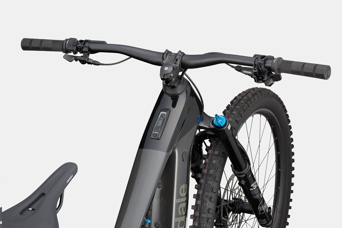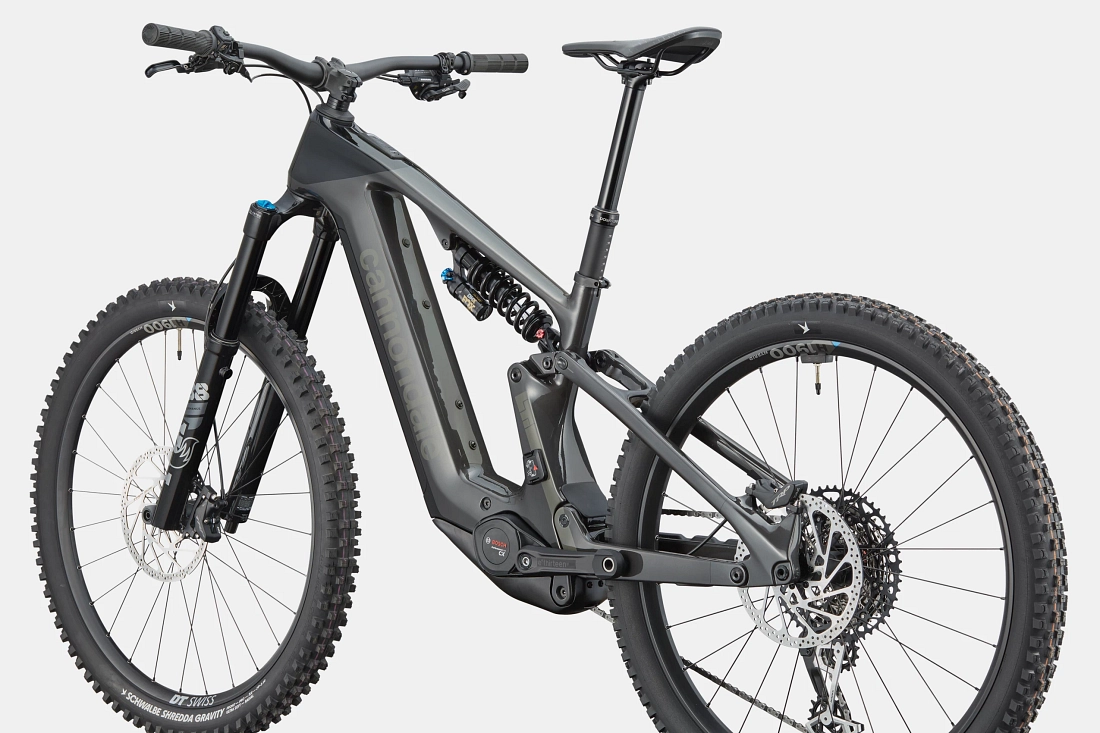 Le Cannondale Moterra LT 1 est un e-VTT long-travel taillé pour les descentes engagées : cadre carbone + aluminium, roues mullet (29″ avant / 27,5″ arrière), 170 mm de débattement avant avec une Fox 38 Performance et 165 mm arrière avec un Fox DHX Performance à ressort.