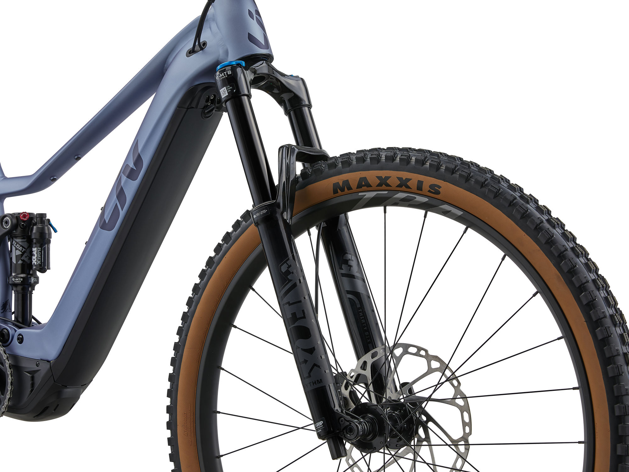 Il repose sur le même cadre en aluminium ALUXX SL avec le système de suspension arrière FlexPoint à biellettes de 140 mm de débattement, mais monte ici en qualité avec un amortisseur Fox Float X 185×52,5 mm — connu pour sa précision et son maintien en conditions extrêmes — et une fourche Fox 36 Rhythm de 150 mm avec amortisseur Grip. Cette combinaison full-Fox représente un saut qualitatif notable par rapport aux E+ 1 et 2 équipés de suspensions Giant, offrant un ressenti plus précis, une meilleure progressivité et un contrôle accru sur les passages les plus techniques.