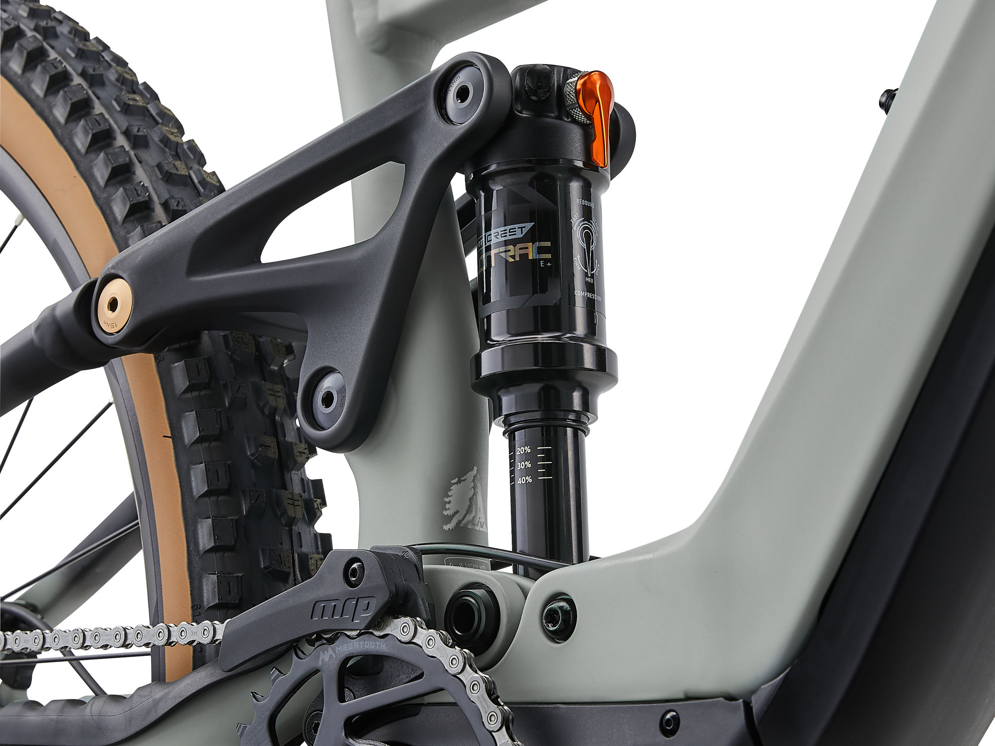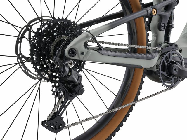 Il repose sur un cadre en aluminium ALUXX SL, reconnu pour son excellent rapport rigidité/poids, associé au système de suspension arrière FlexPoint à biellettes offrant 140 mm de débattement avec un amortisseur Giant Crest FloTrac 3 positions à 185×52,5 mm. La fourche Giant STL 36 Air de 150 mm à compression réglable sur 5 positions, e-bike optimisée, avec axe traversant Boost 110×15 mm, complète cette configuration pour une absorption des chocs optimale et une confiance accrue dans les sections rapides ou techniques.