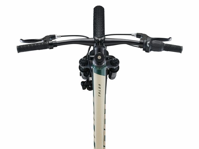 Transmission 1×7 Shimano Tourney + shifter REVOSHIFT + plateau 32 dents / cassette 14-34 : simplicité, facilité d’entretien, passage de vitesses sécurisant pour les premiers niveaux.