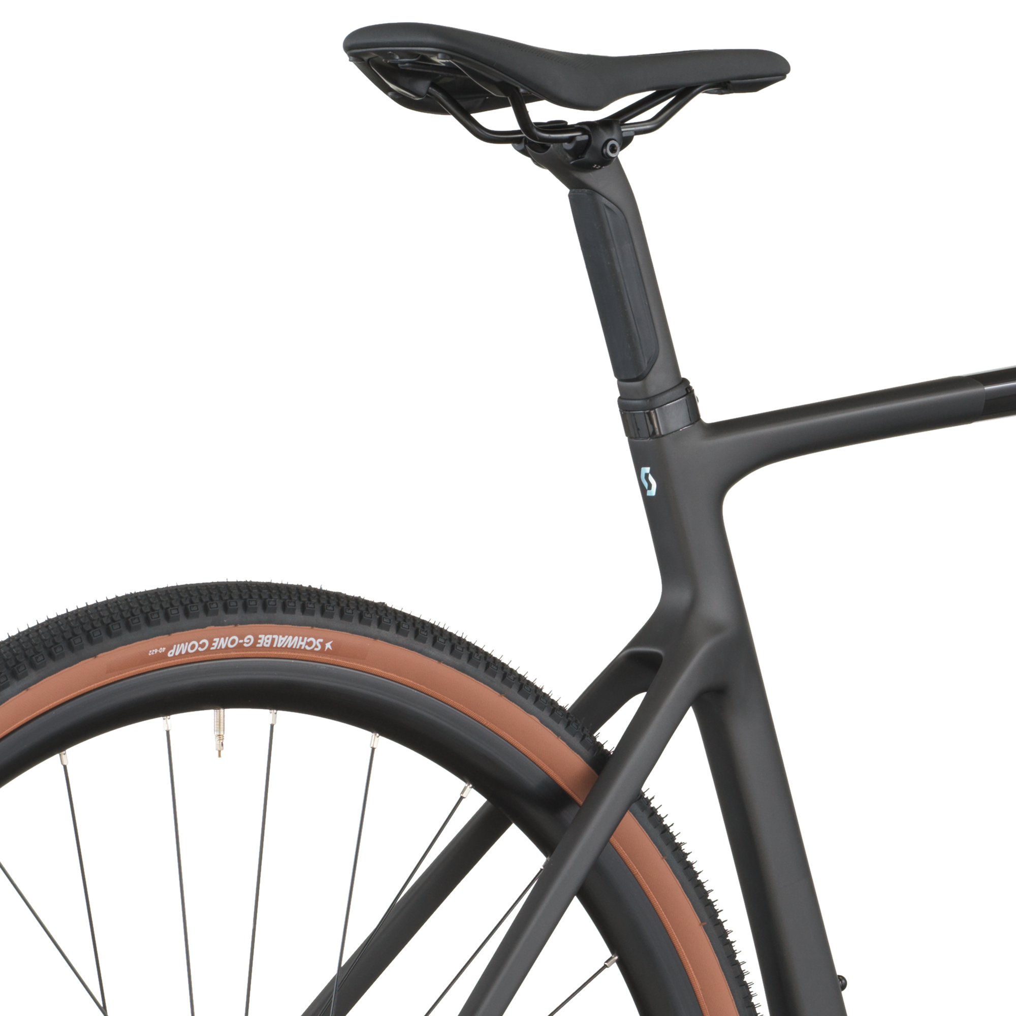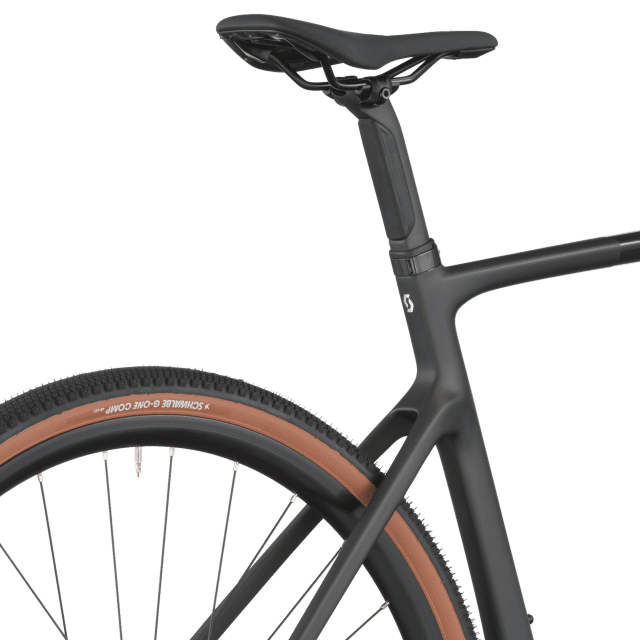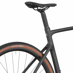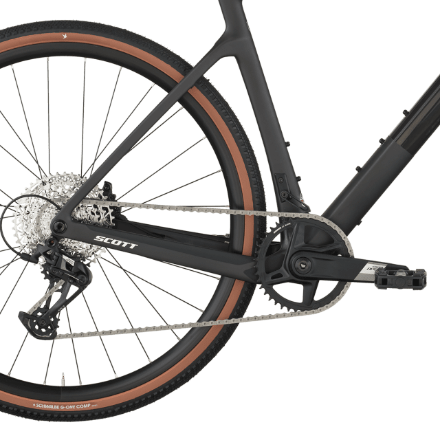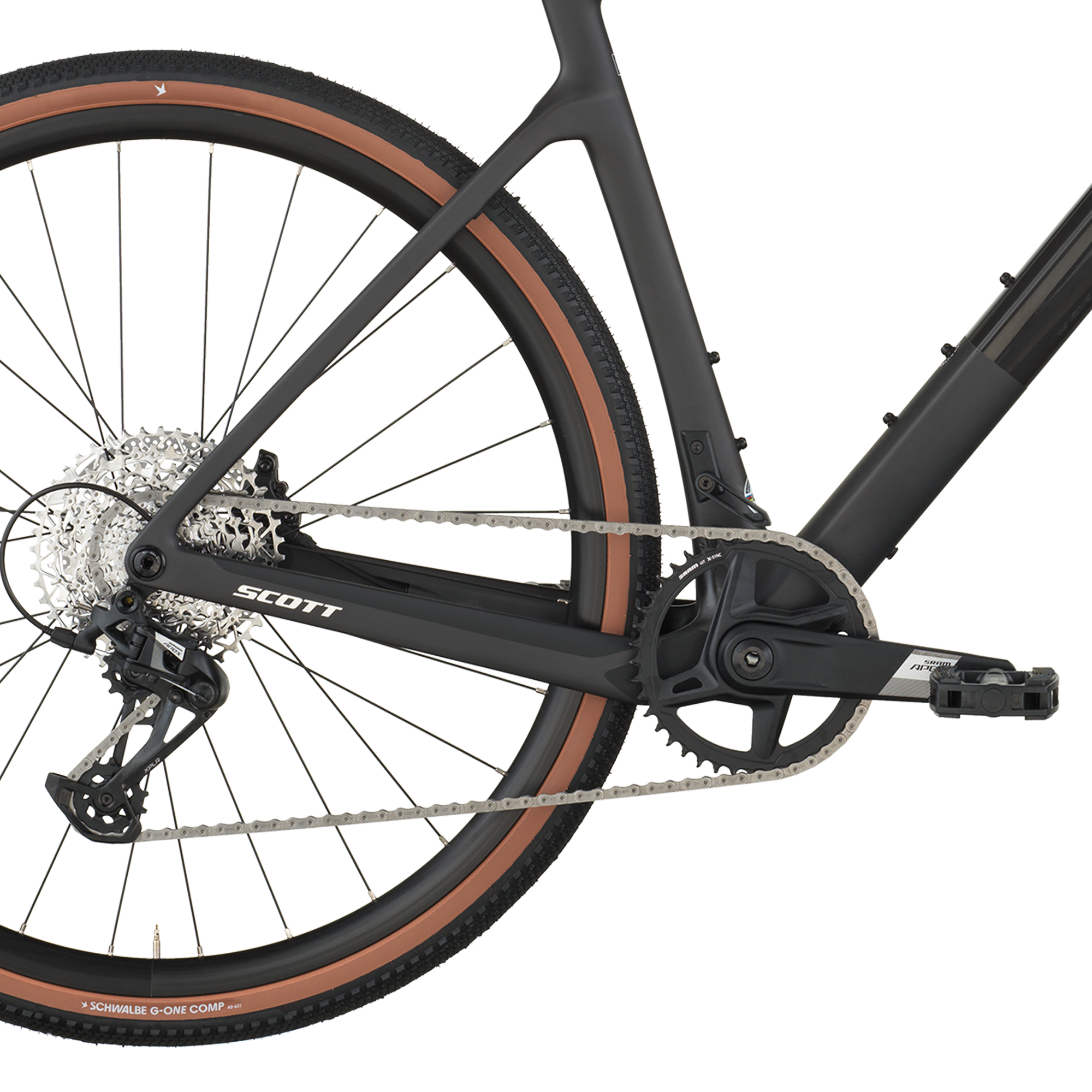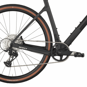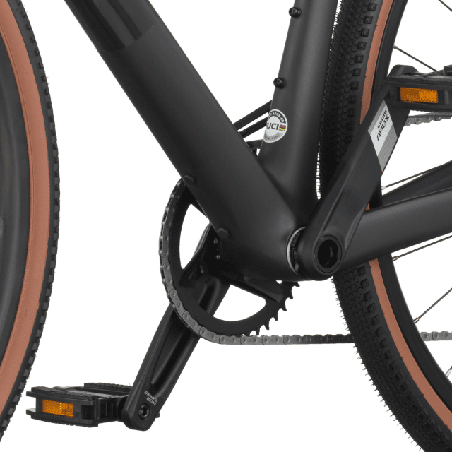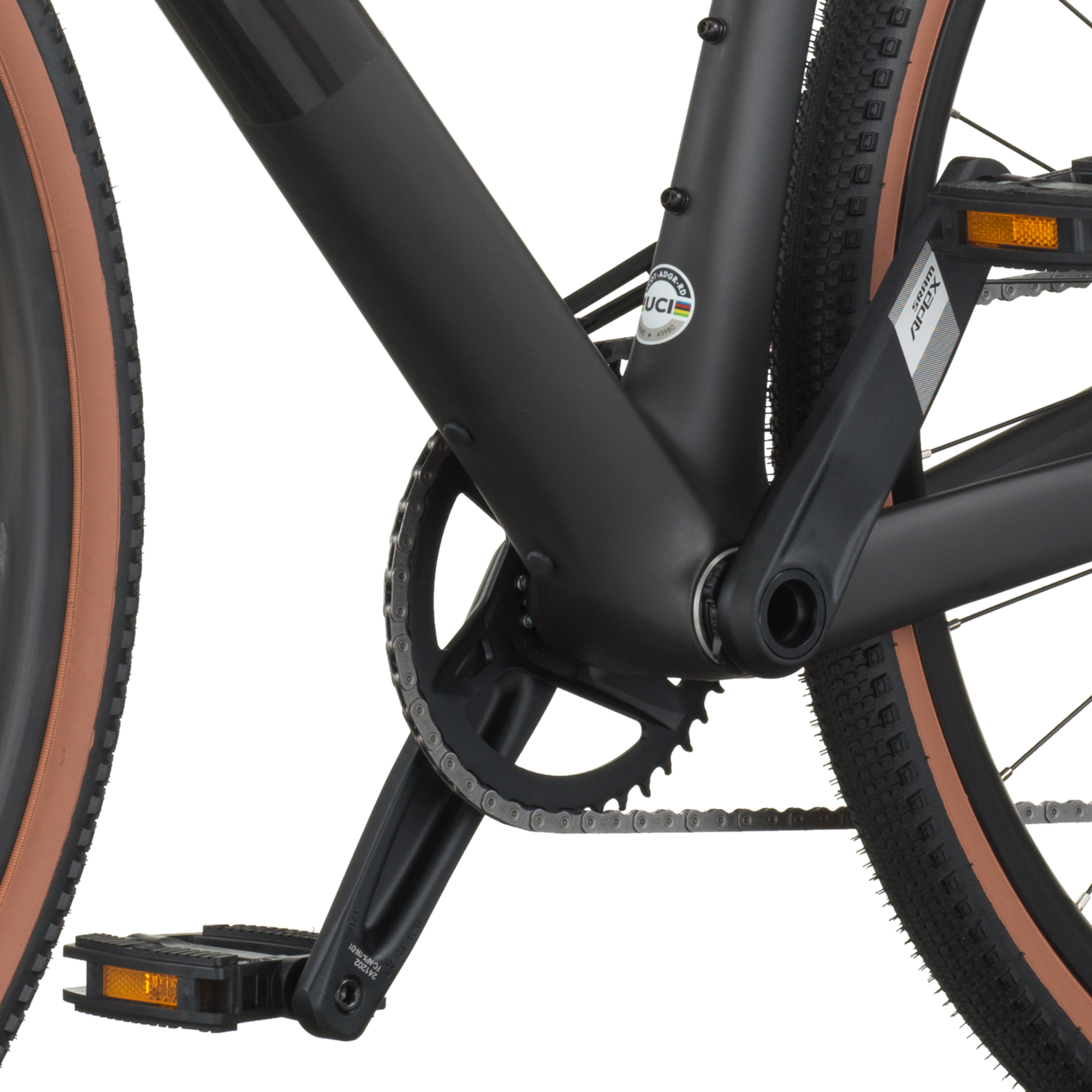 La transmission est une SRAM APEX XPLR 12 vitesses (manettes SRAM SX Eagle Trigger, pédalier APEX DUB Wide 42 T, cassette 10-44 T), offrant une plage de développements polyvalente adaptée aux parcours vallonnés comme aux relances urbaines.
