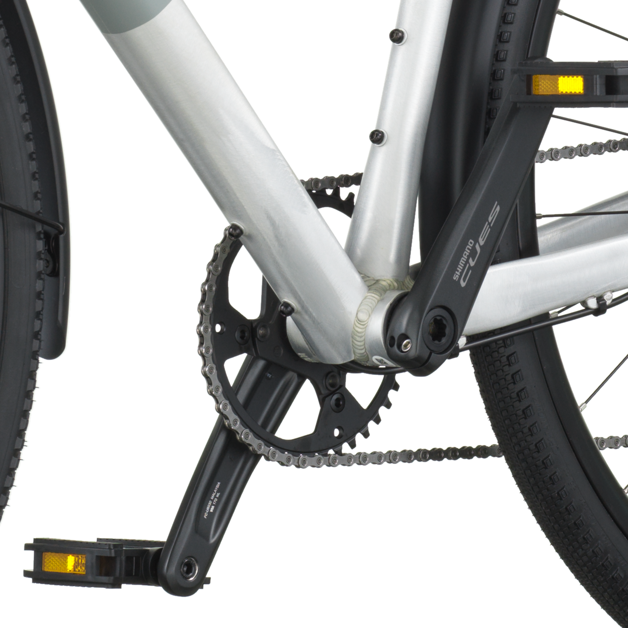 La transmission est une Shimano CUES 9 vitesses (manettes SL-U4000-9, dérailleur RD-U4000 et cassette 11-46 T) avec un pédalier Shimano FC-U6030-1-42 T, offrant une plage de développements adaptée aux parcours urbains, vallonnés ou mixtes.
