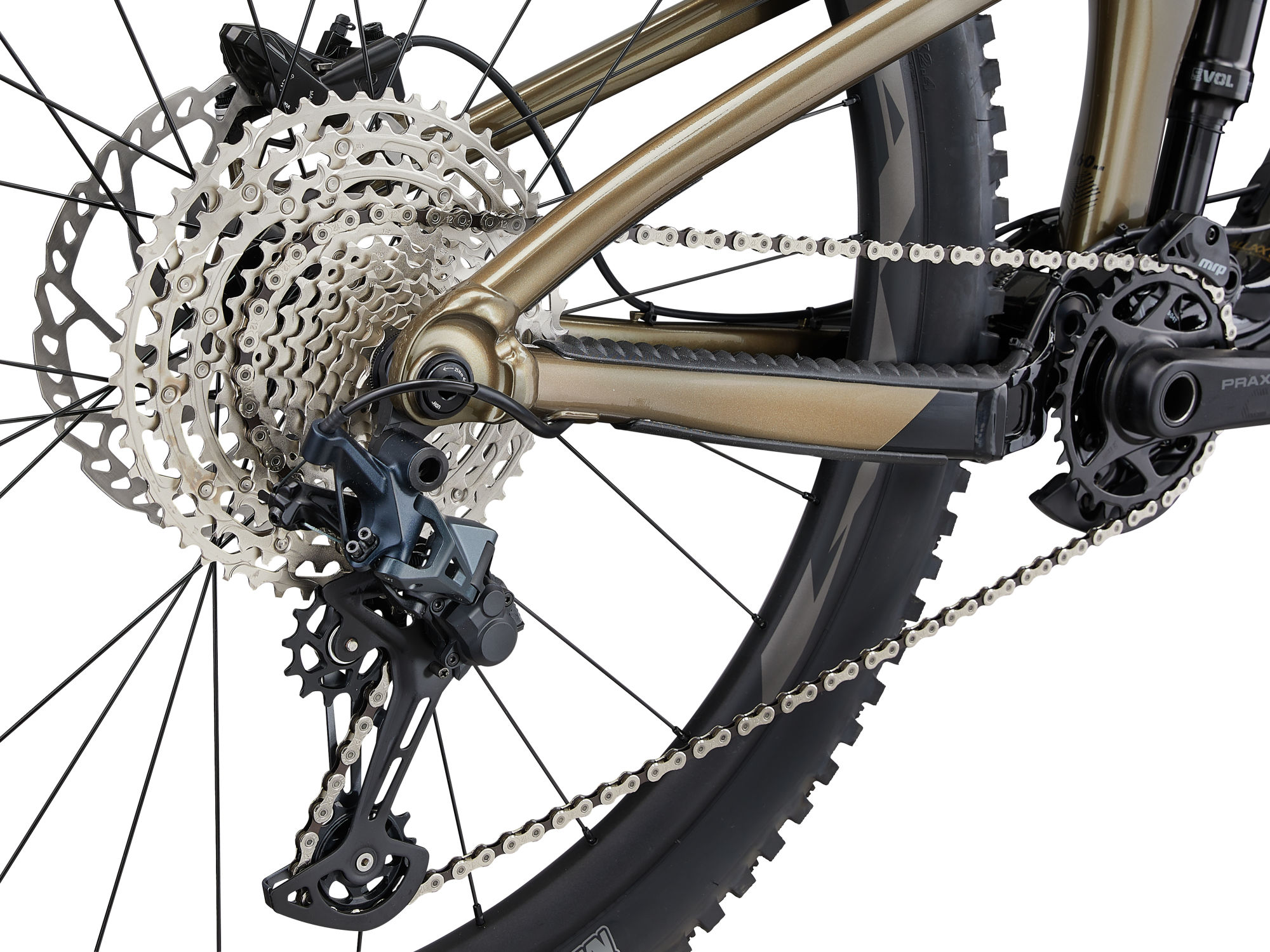 Roues de type 29″ à l’avant, pneus généreux type Maxxis Assegai / Minion DHR II (≈ 2,4-2,5″) pour un bon grip, tout en conservant la maniabilité, et possibilité de réglage de la géométrie grâce à un flip-chip pour ajuster la stabilité ou l’agilité selon le terrain.